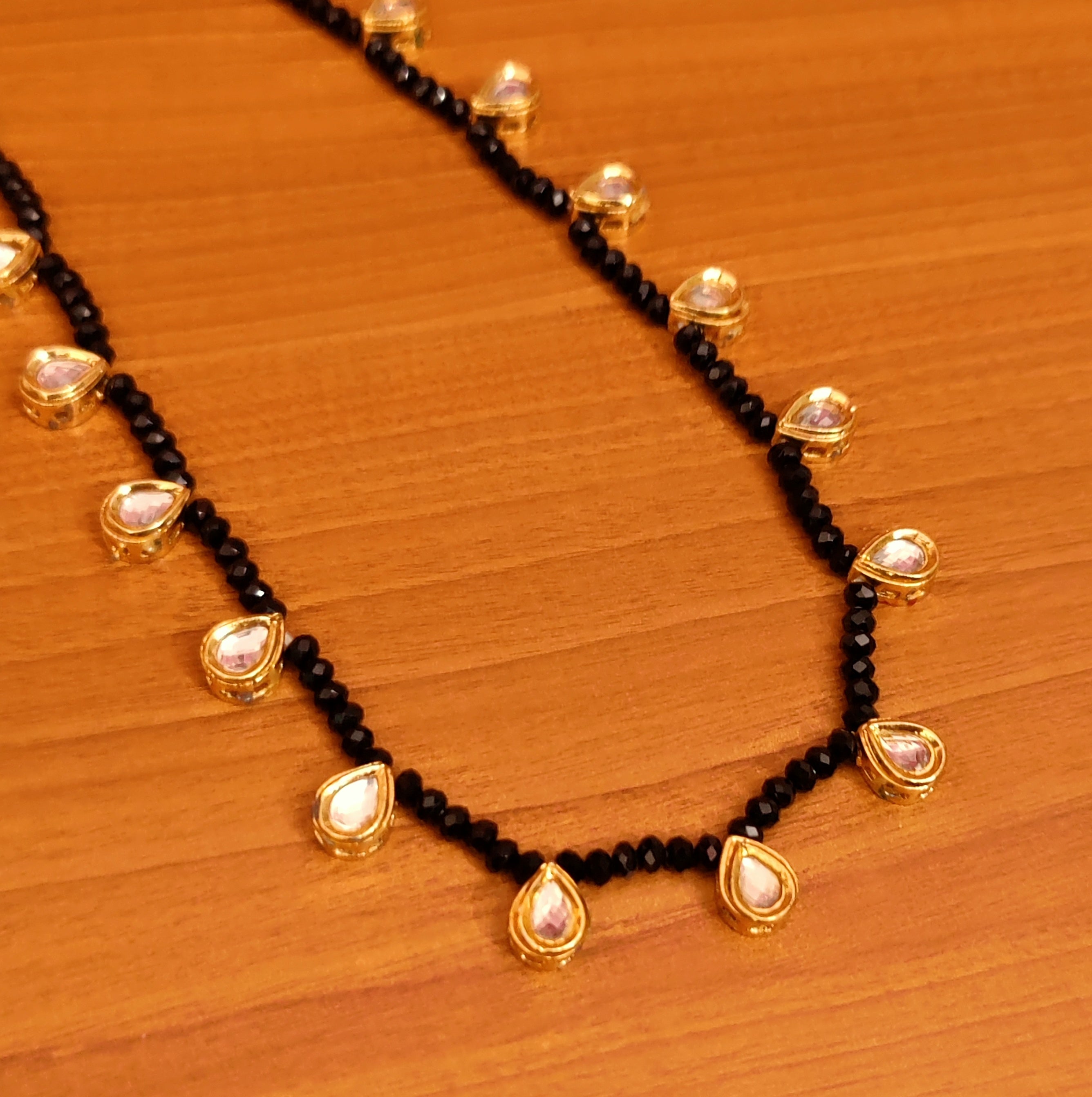 This beautiful mangalsutra is handcrafted in brass alloy with imitation black crystal beads & kundan work of very fine quality , this mangalsutra is coated with 18 kt nickle free gold plating to avoid skin allergies and its very light in weight .