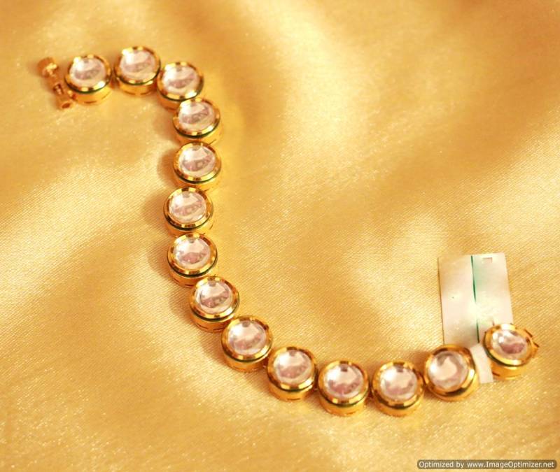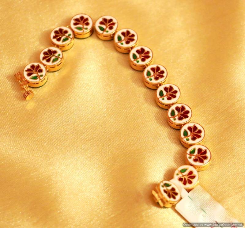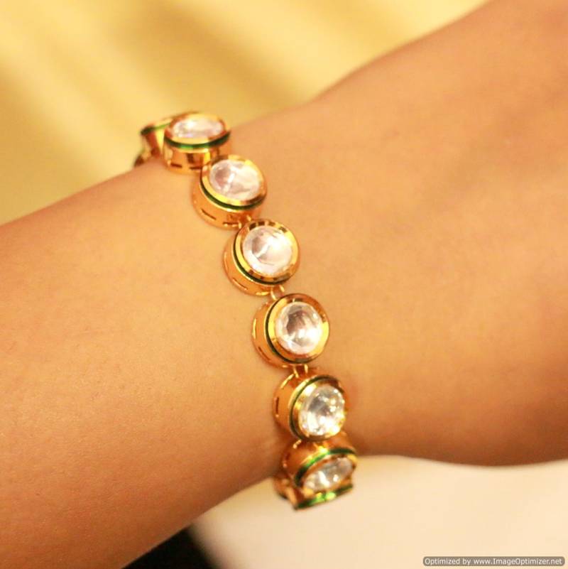 This beautiful bracelet is handcrafted in silver alloy with imitation kundan with meenakari work of very fine quality . This bracelet is coated with 18 kt gold polish which give them a unique look . An absolutely stunning piece to own and are very light in weight.