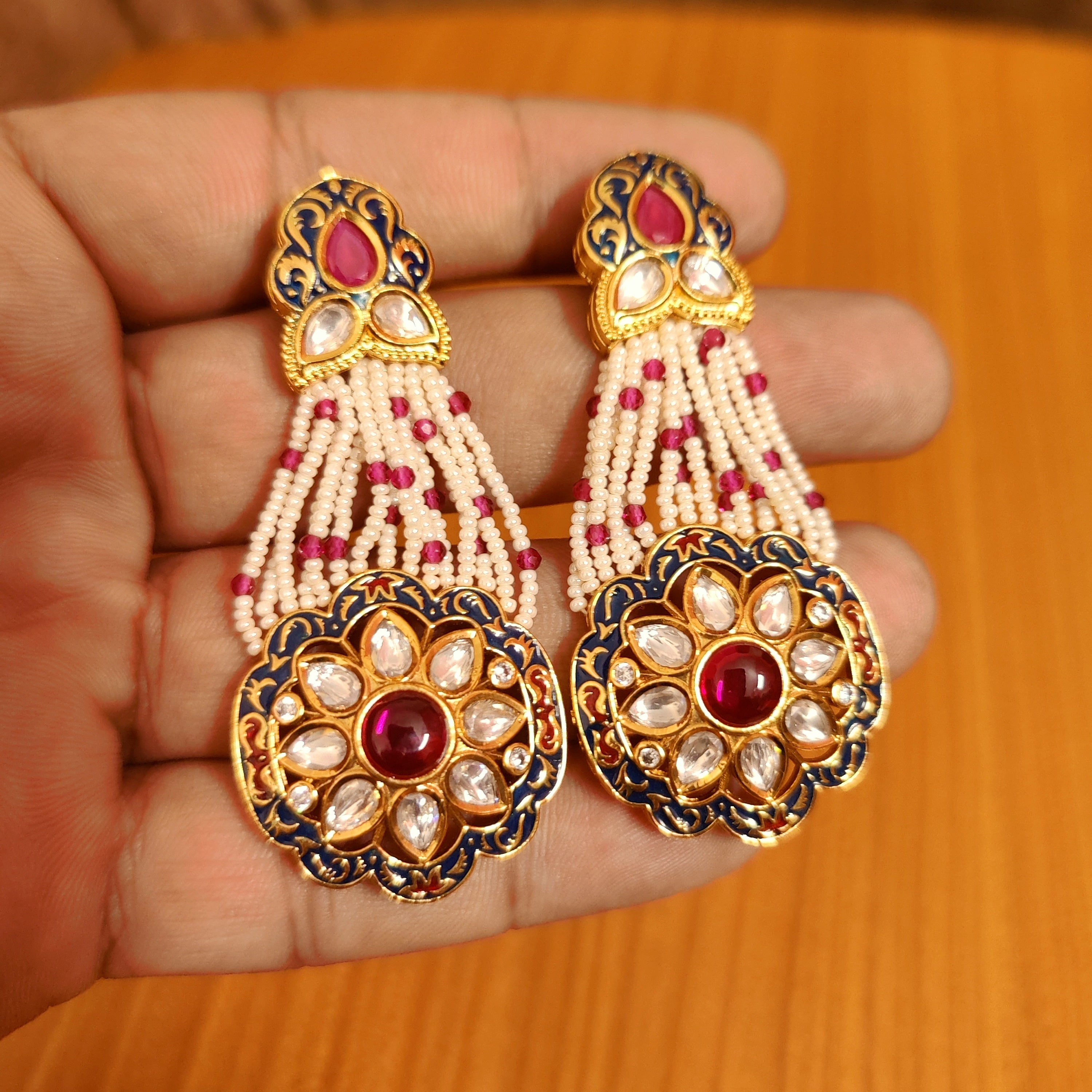 This exquisite necklace set combines traditional and modern elements with its blue meenakari work and kundan polki stones, accented by a pop of red and delicate pearls. With a perfect matching pair of earrings, it's the perfect choice for weddings, parties, and special occasions for a unique and on-trend look!