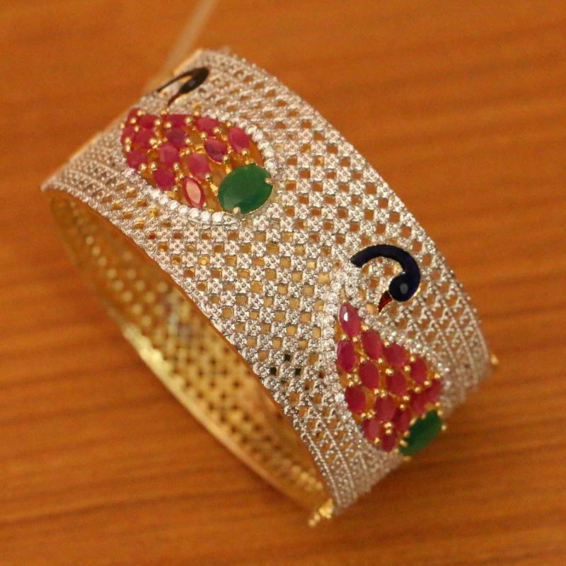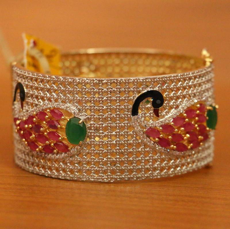 This peacock pattern bangle & bracelet is handcrafted in silver alloy with imitation red ruby & green emerald and cz quartz of very fine quality . This artistic yet modern bangle & bracelet is plated with fine nickle free gold rhodium to avoid any allergies to the skin.