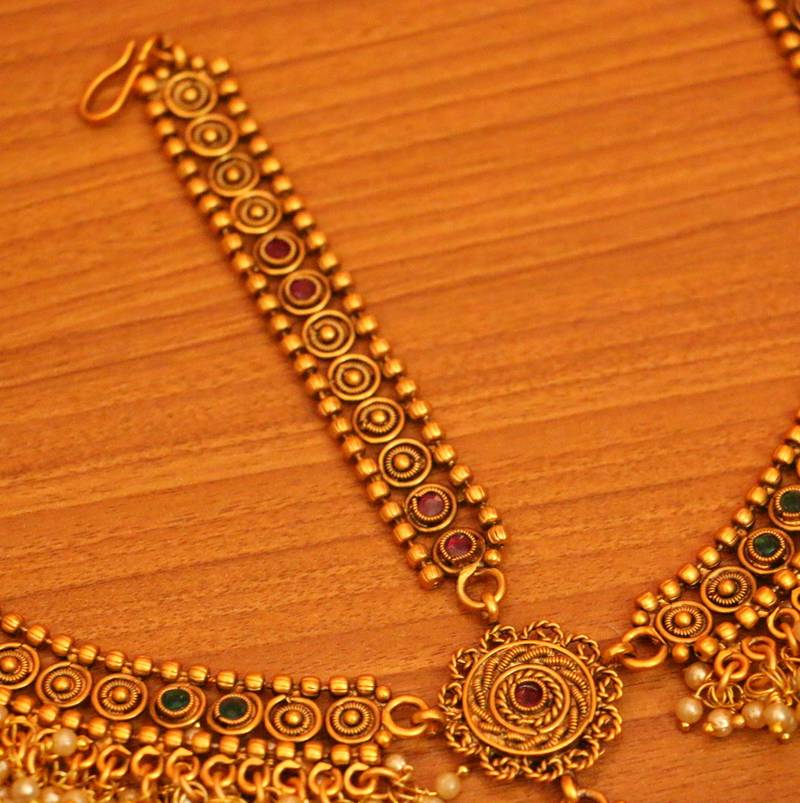 This Gold Look Bridal Mathapatti Is Handcrafted In Copper Alloy With Imitation Coloures Stones And Pearls With 18kt Fine Gold Plating . This Mathapatti Is Very Light In Weight And Gives You A Real Gold Look. An Absolutely Stunning Piece To Own And Are Very Light In Weight.