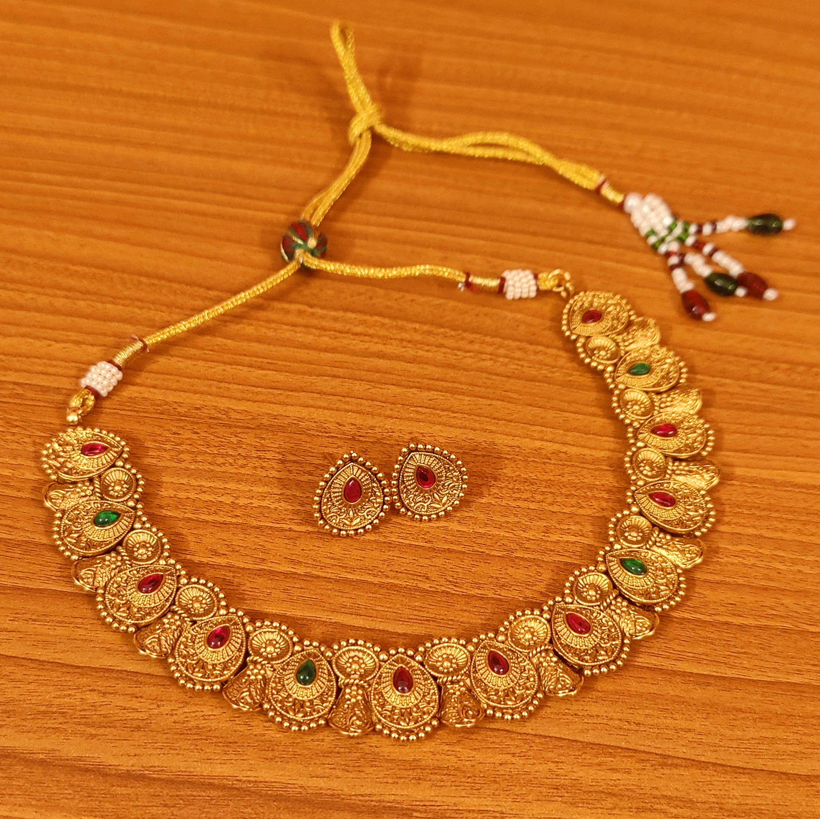 MULTICOLOUR KEMP STONES GOLD PLATED ANTIQUE NECKLACE SET