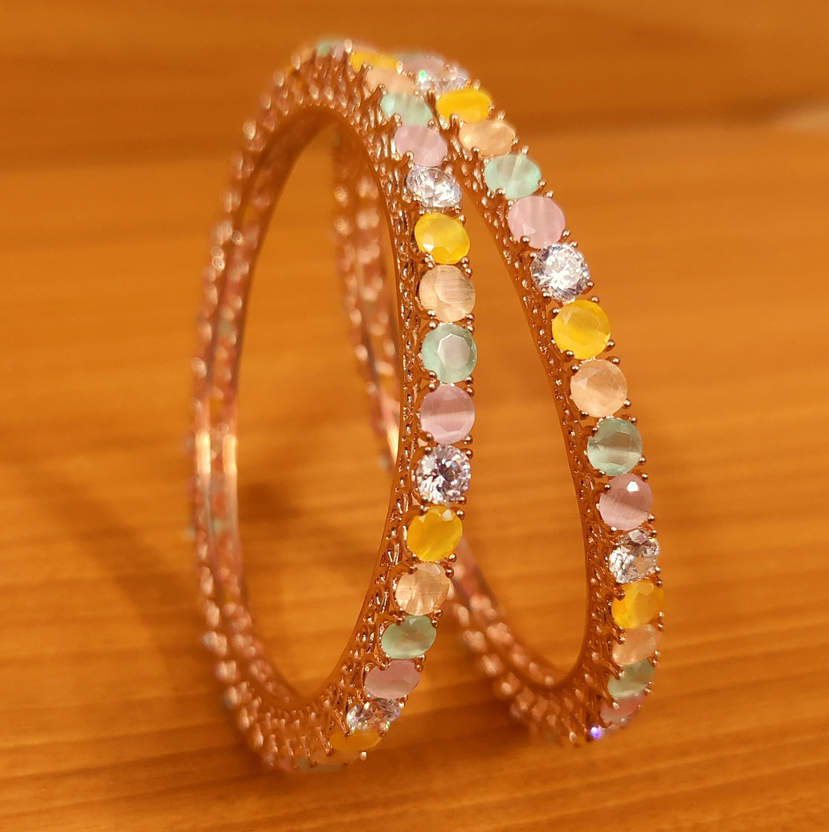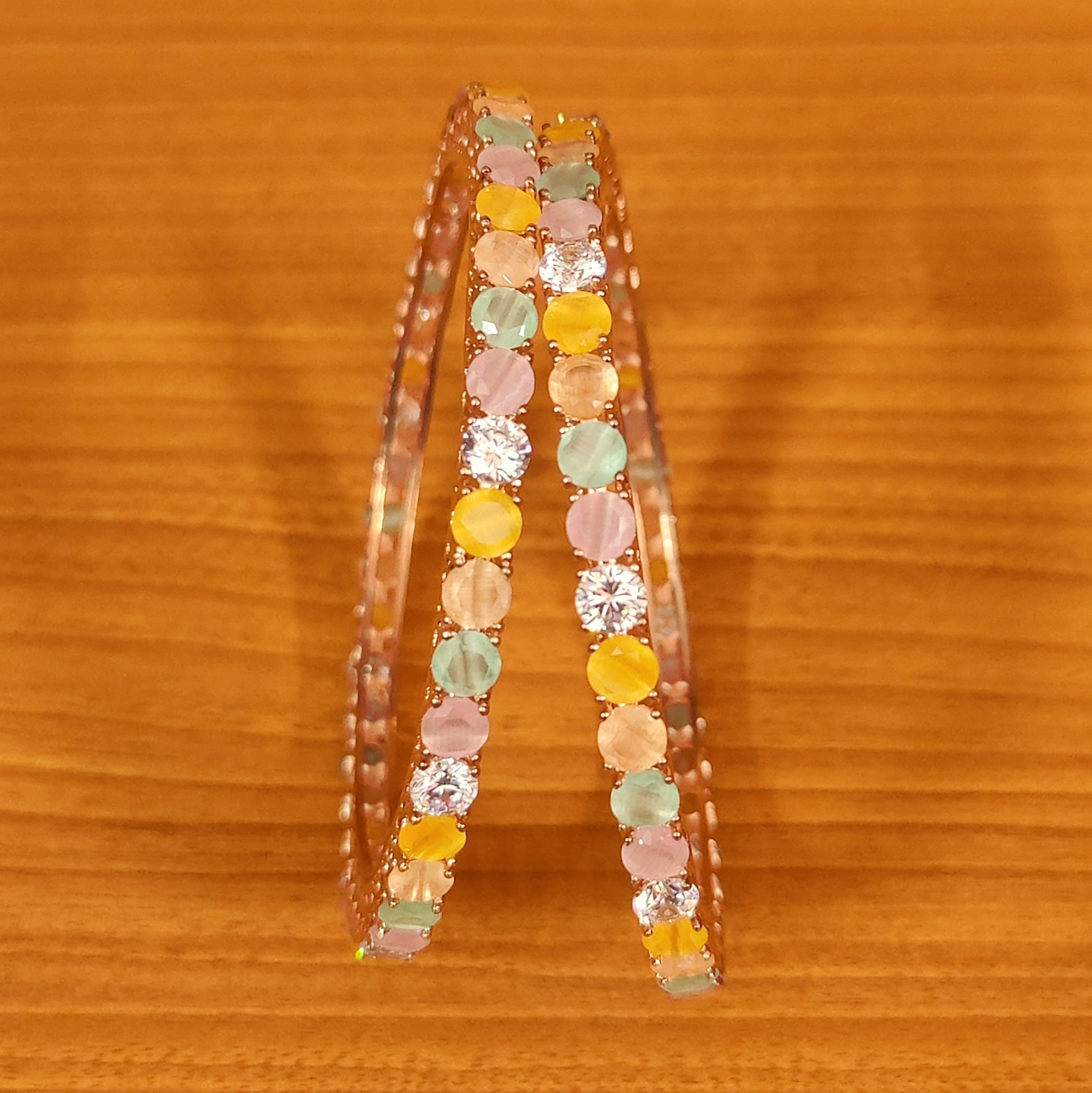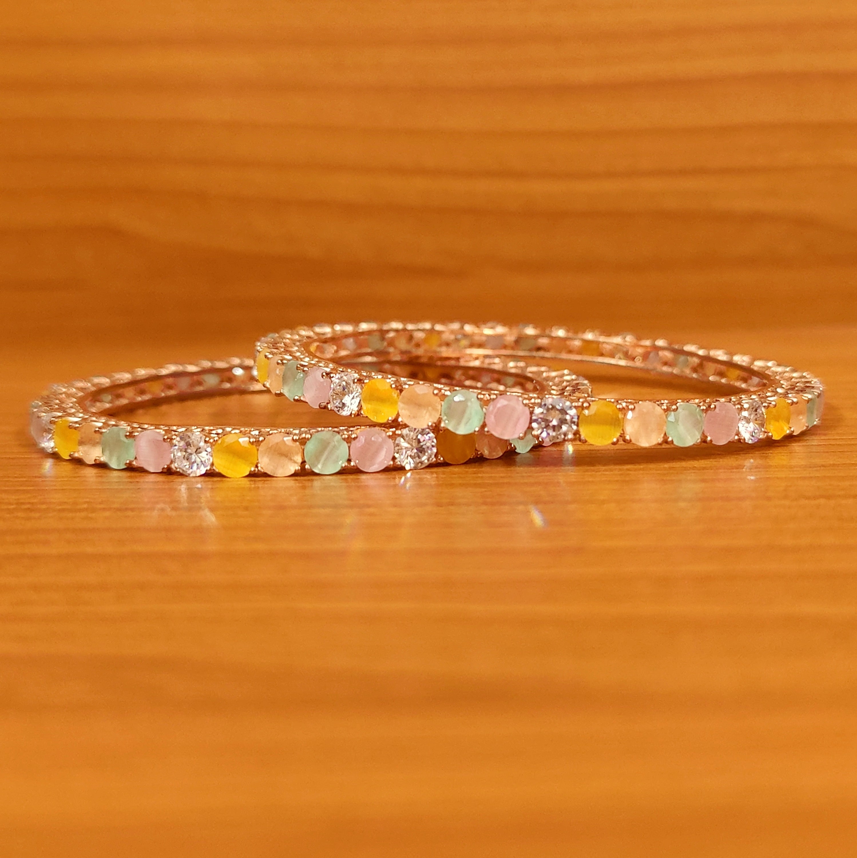 These american diamond single line bangles are handcrafted in silver alloy with imitation multicolour pastel shade colour stones of very fine quality. These single line bangles are coated with 18 kt rose gold plating that gives a real look to the design, these bangles comes in a pair of two.