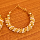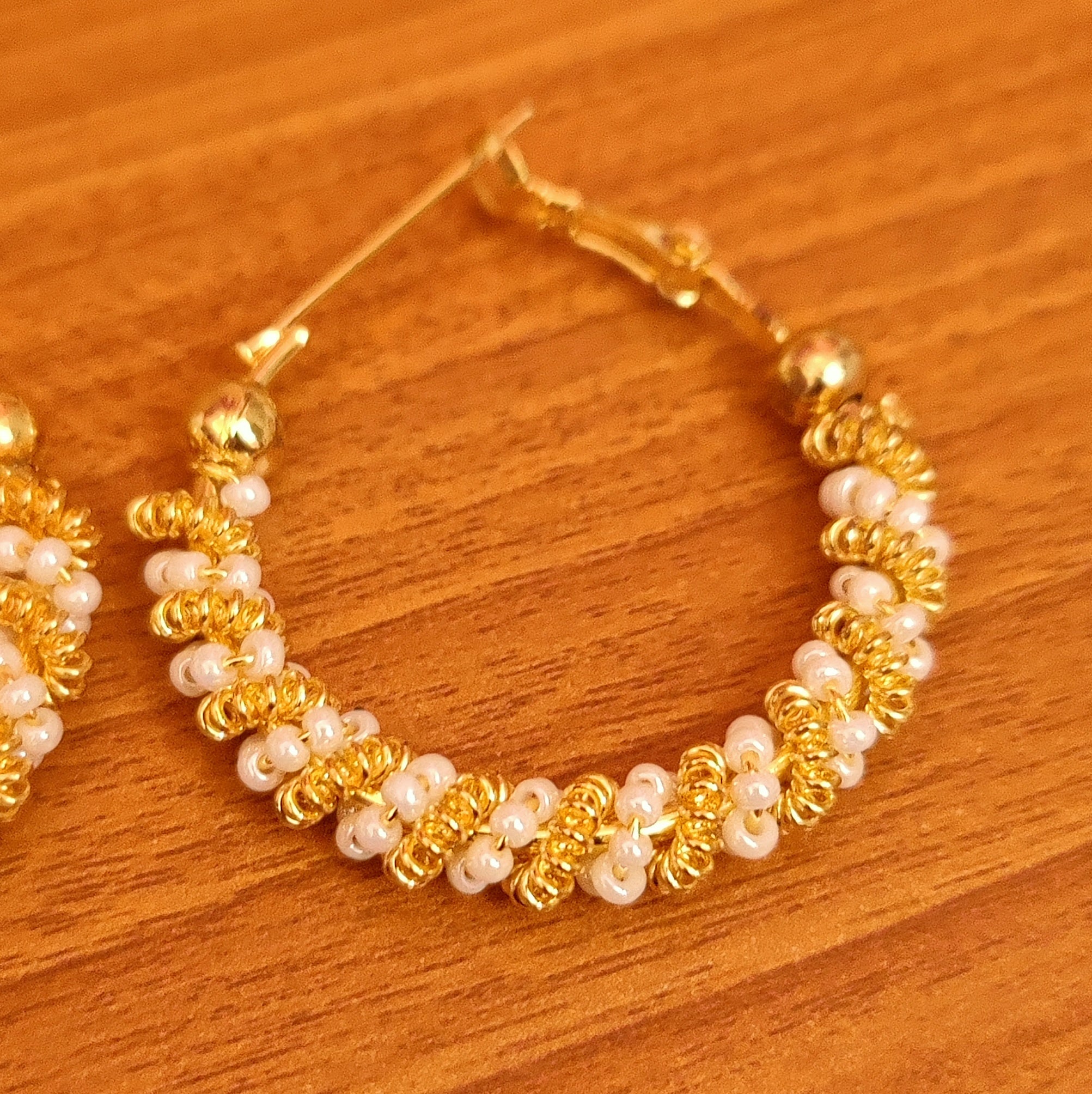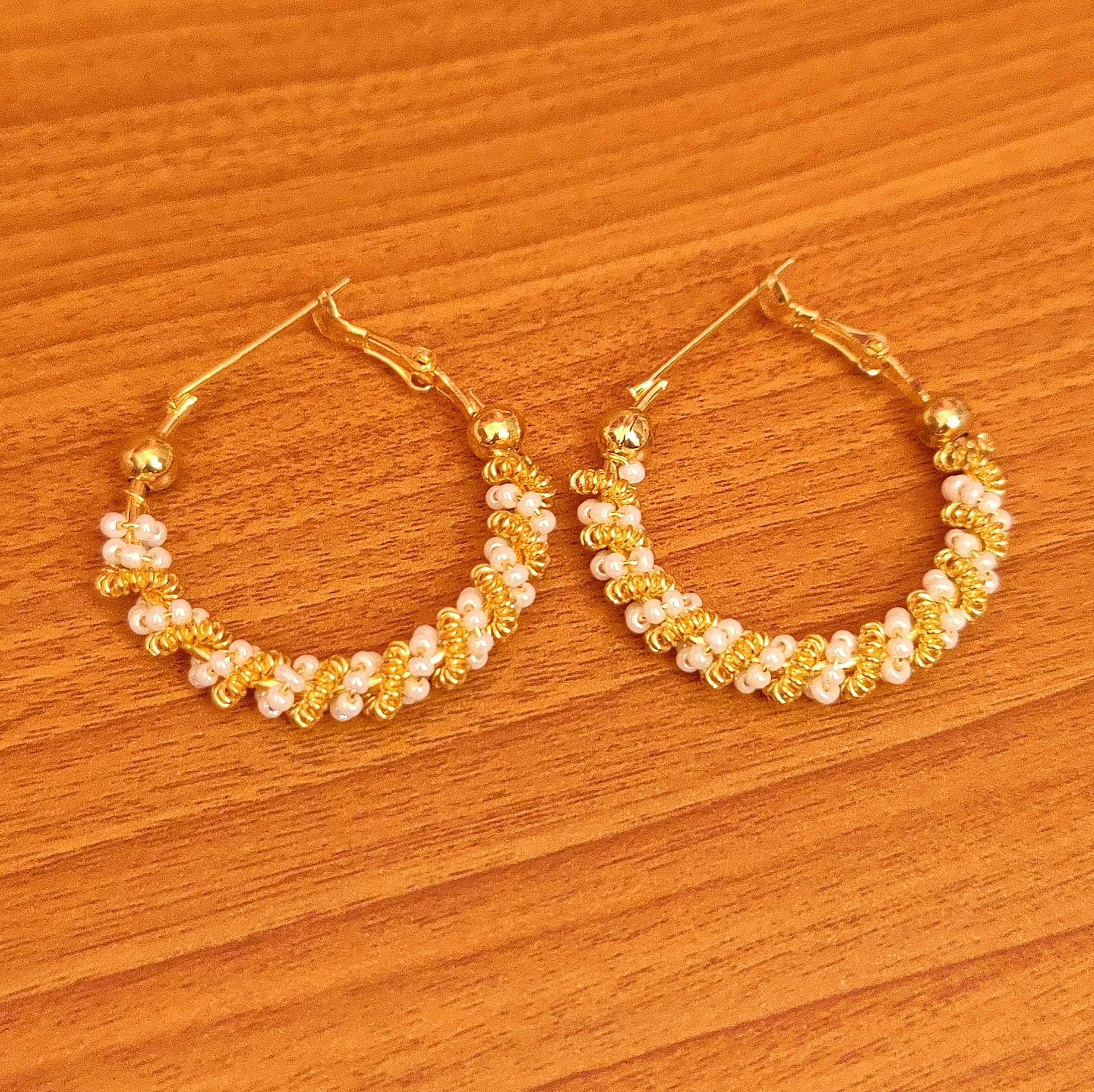 These hoops are handcrafted in brass alloy with imitation semi precious white pearls of very fine quality. these artistic yet modern hoops are plated with high quality gold rhodium. the earrings are very light in weight.