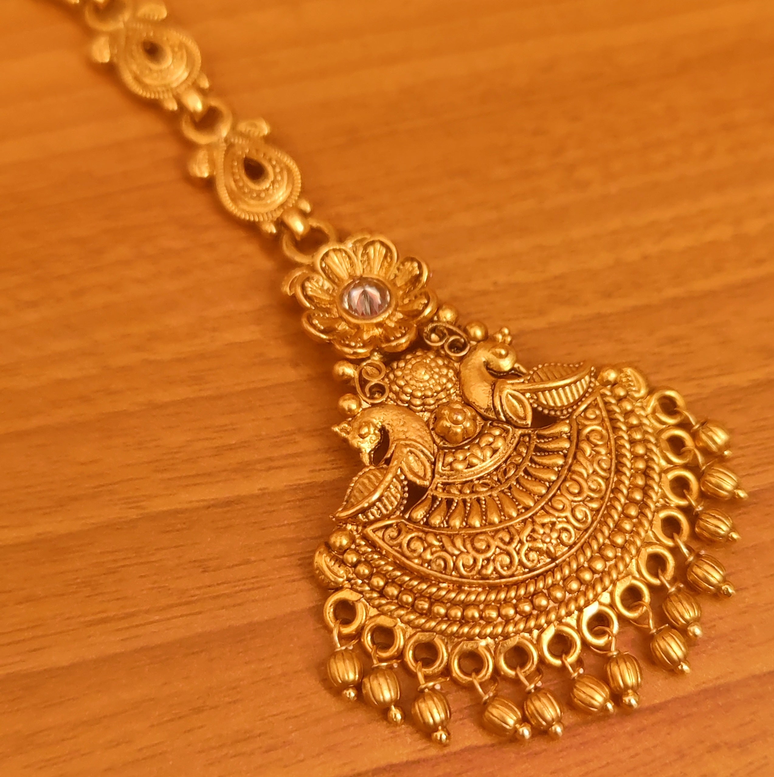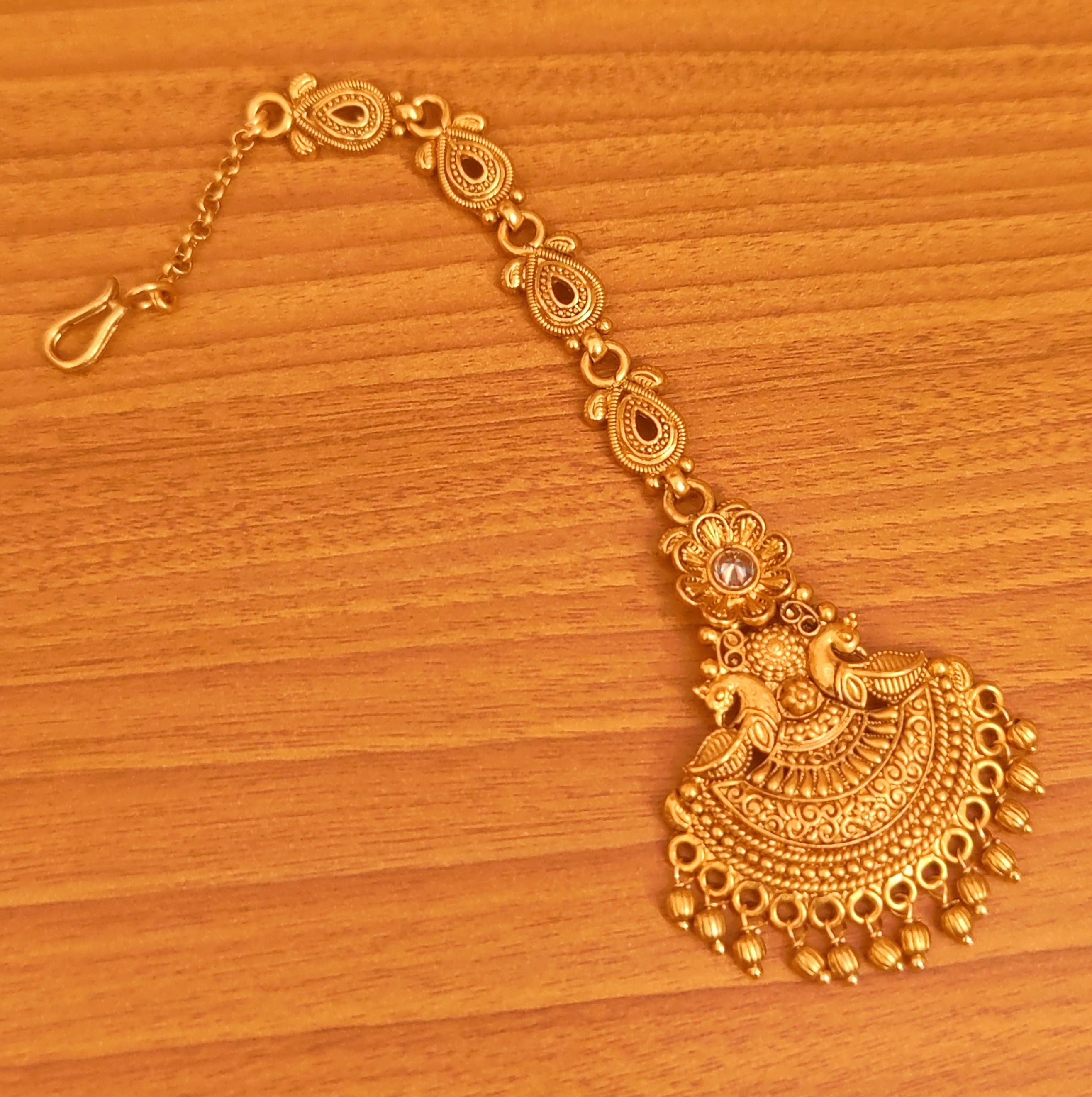 This peacock pattern maang tikka is handcrafted in copper alloy with imitation zircon & gold polki work of very fine quality . this maang tikka is coated with 18 kt gold polish which give it a real look . an absolutely stunning piece to own and is very light in weight.