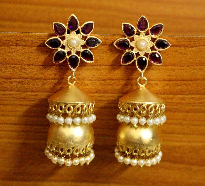 These beautiful earrings are handcrafted in copper alloy with imitation purple onyx,pearls & polki with matt finishing work of very fine quality. These earrings are coated with 18 kt yellow gold polish which give them a unique look . An absolutely stunning piece to own and are very light in weight.