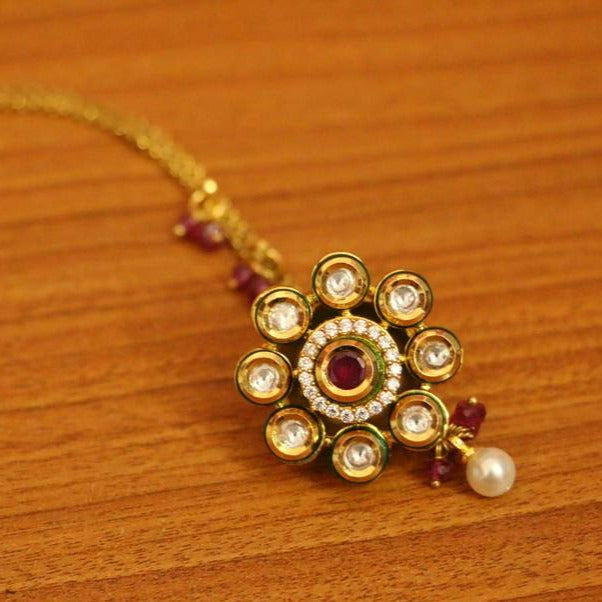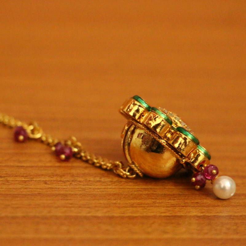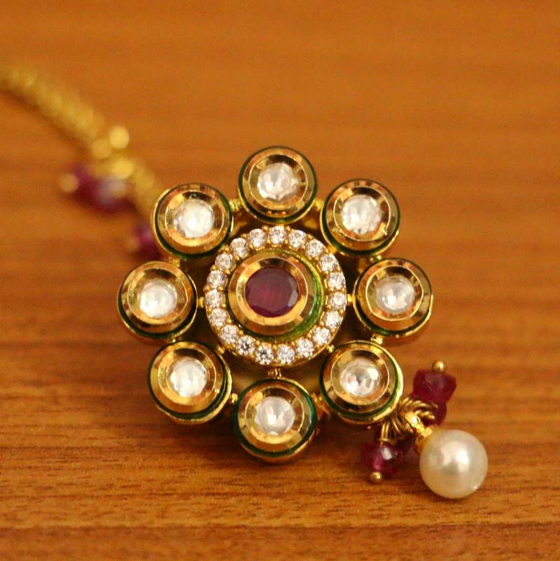 This Kundan Meenakari And Ruby Gold Look Maang Tikka Is Handcrafted In Brass Alloy With 18kt Fine Gold Plating And Pearls Of Fine Quality . This Maangtikka Is Very Light In Weight And Gives You A Real Gold Look. An Absolutely Stunning Piece To Own And Are Very Light In Weight.