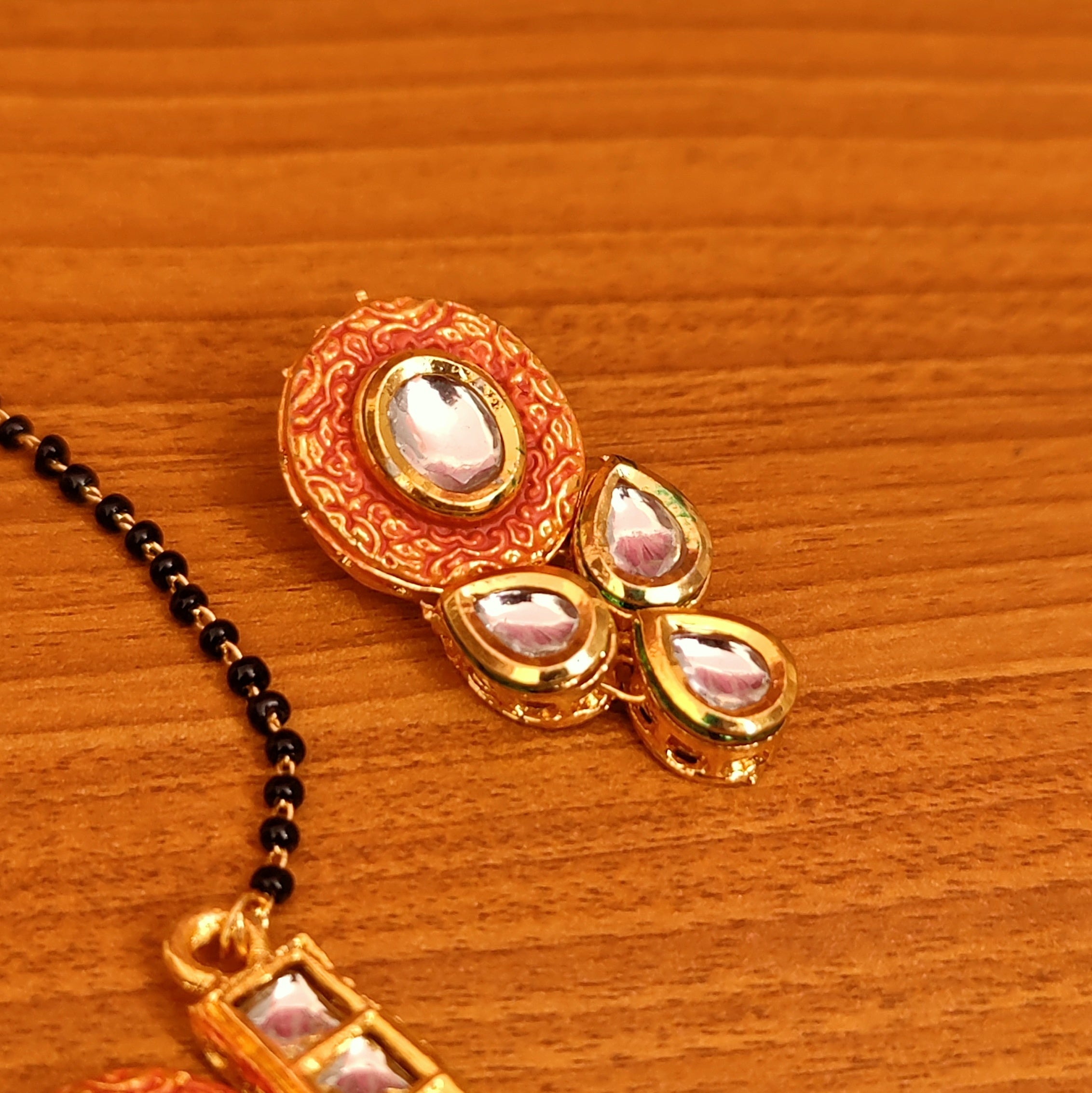 This beautiful mangalsutra is handcrafted in brass alloy with imitation kundan with orange meenakari work of very fine quality , this mangalsutra is coated with 18 kt nickle free gold plating to avoid skin allergies and its very light in weight .