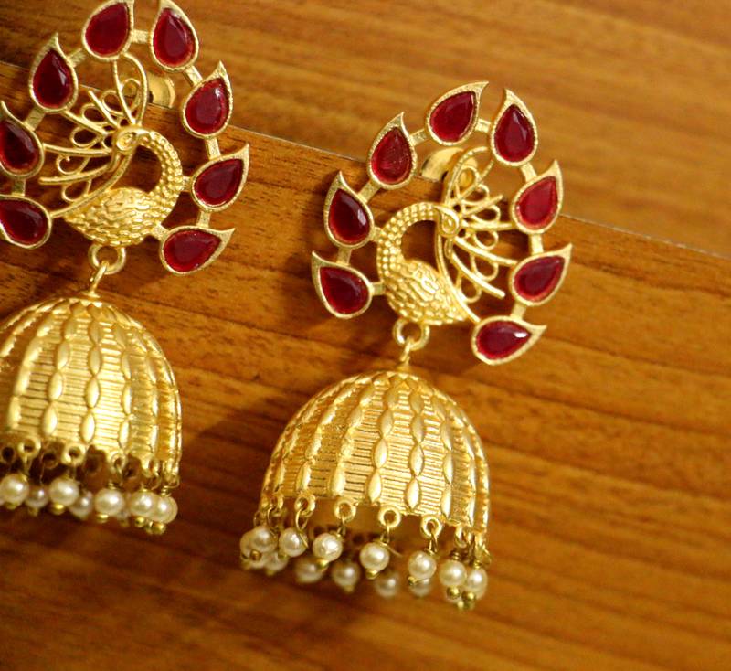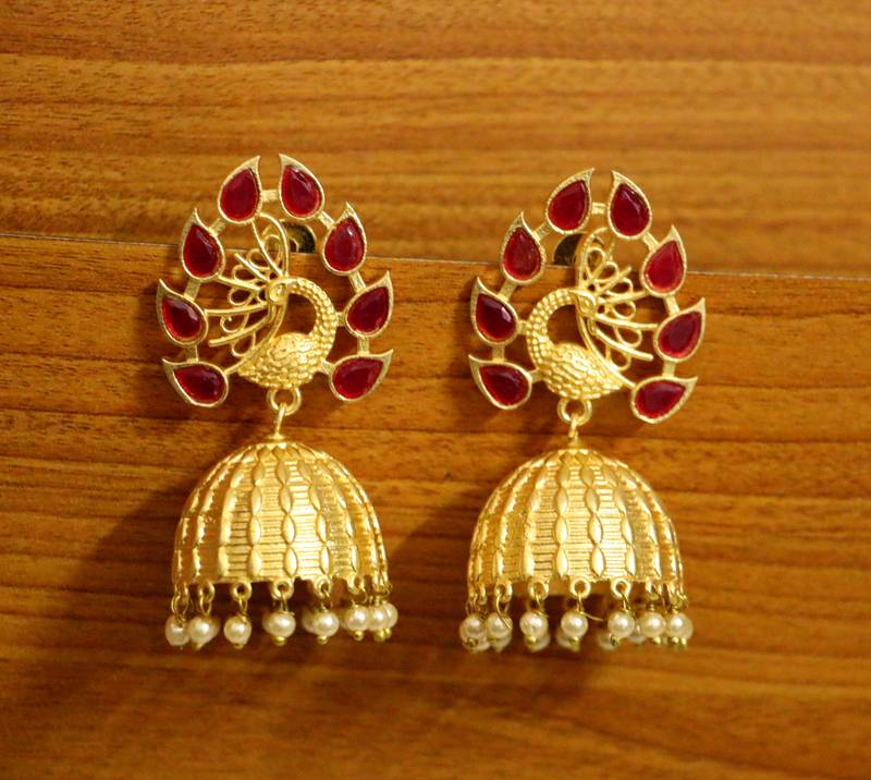 These beautiful peacock looking earrings are handcrafted in copper alloy with imitation ruby,pearls & polki with matt finishing work of very fine quality. These earrings are coated with 18 kt yellow gold polish which give them a unique look . An absolutely stunning piece to own and are very light in weight.