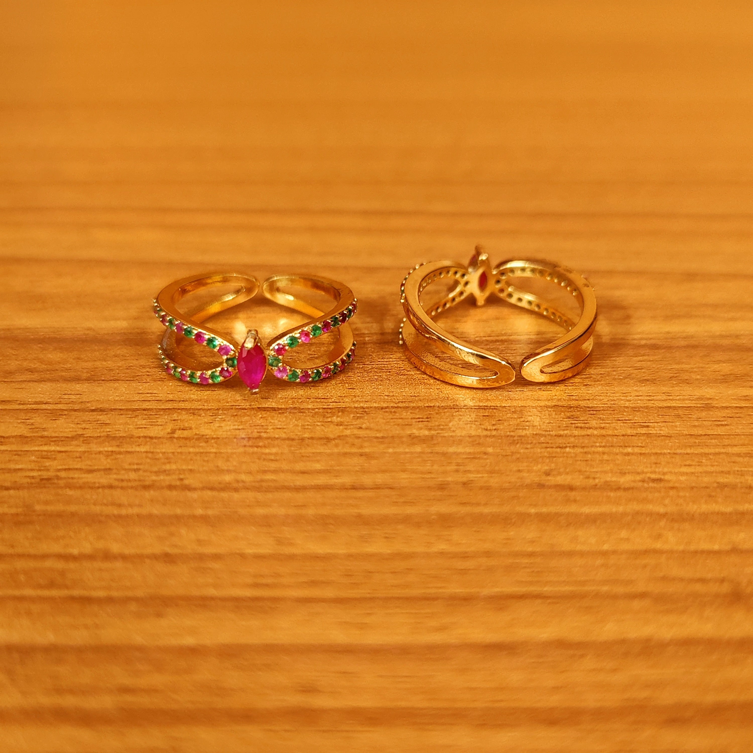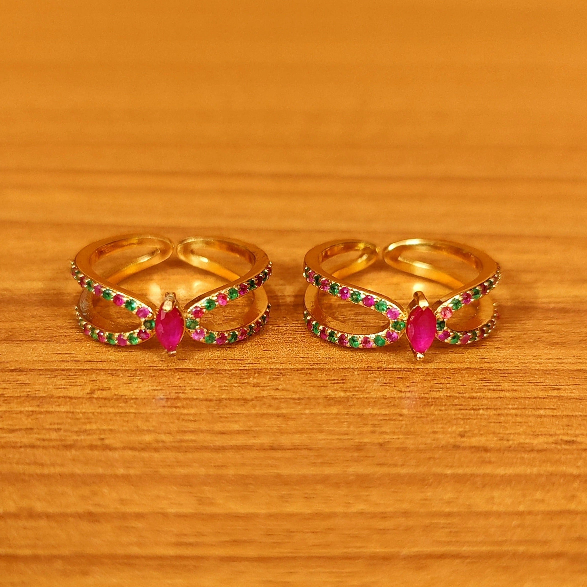 These gold look toe rings are made in silver and brass alloy with imitation ruby colour cz stones of very fine quality. These cute toe rings are handcrafted to perfection with high quality finish as seen in real diamond jewellery and are plated with 18kt nickle free gold rhodium that gives the design a real look.