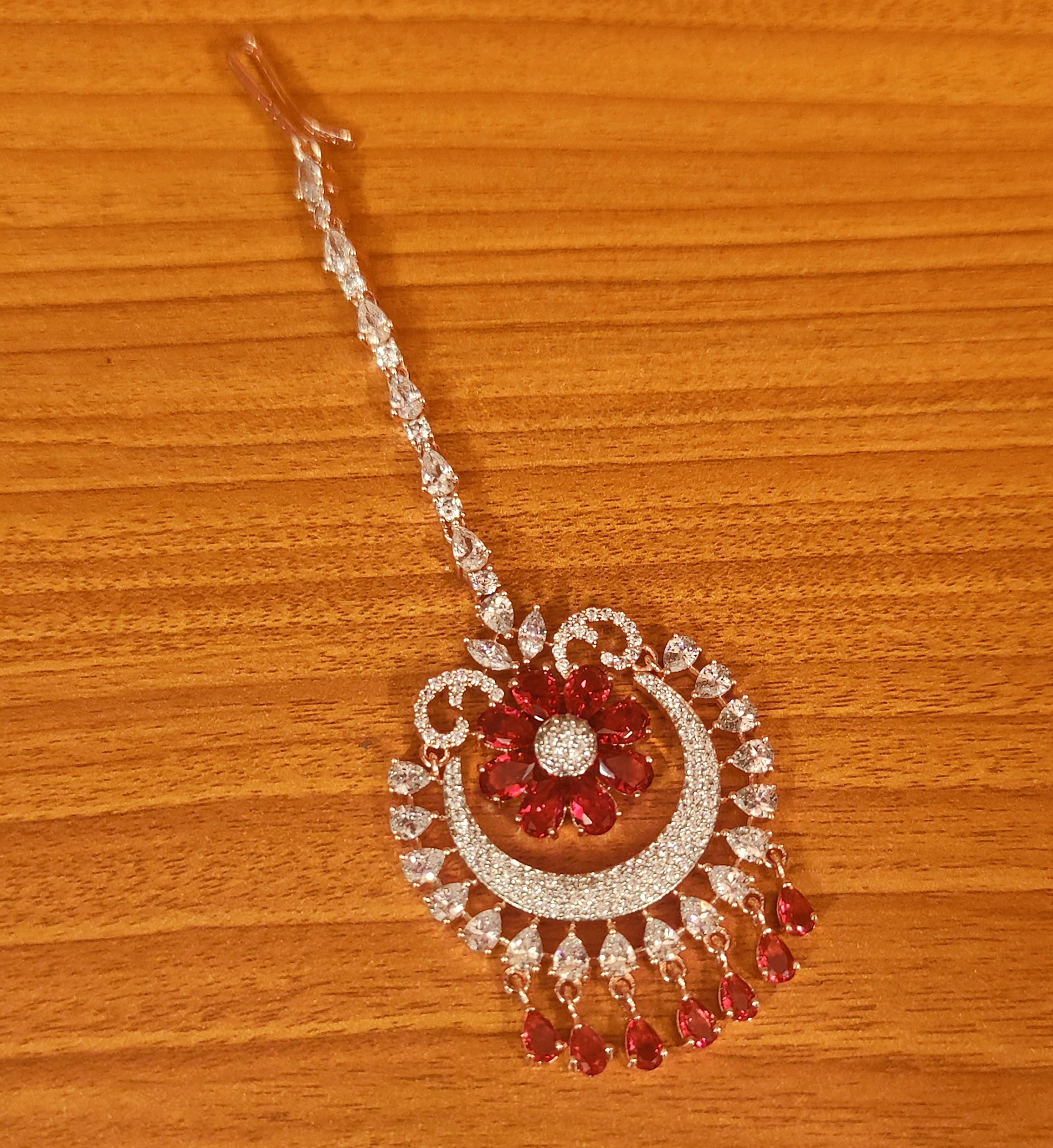 This diamond look maangtikka is handcrafted in silver alloy with imitation red glass stone and american diamonds of very fine quality. This gorgeous maang tikka is plated with 18kt fine nickle free rose gold rhodium that gives a real gold look to the design.
