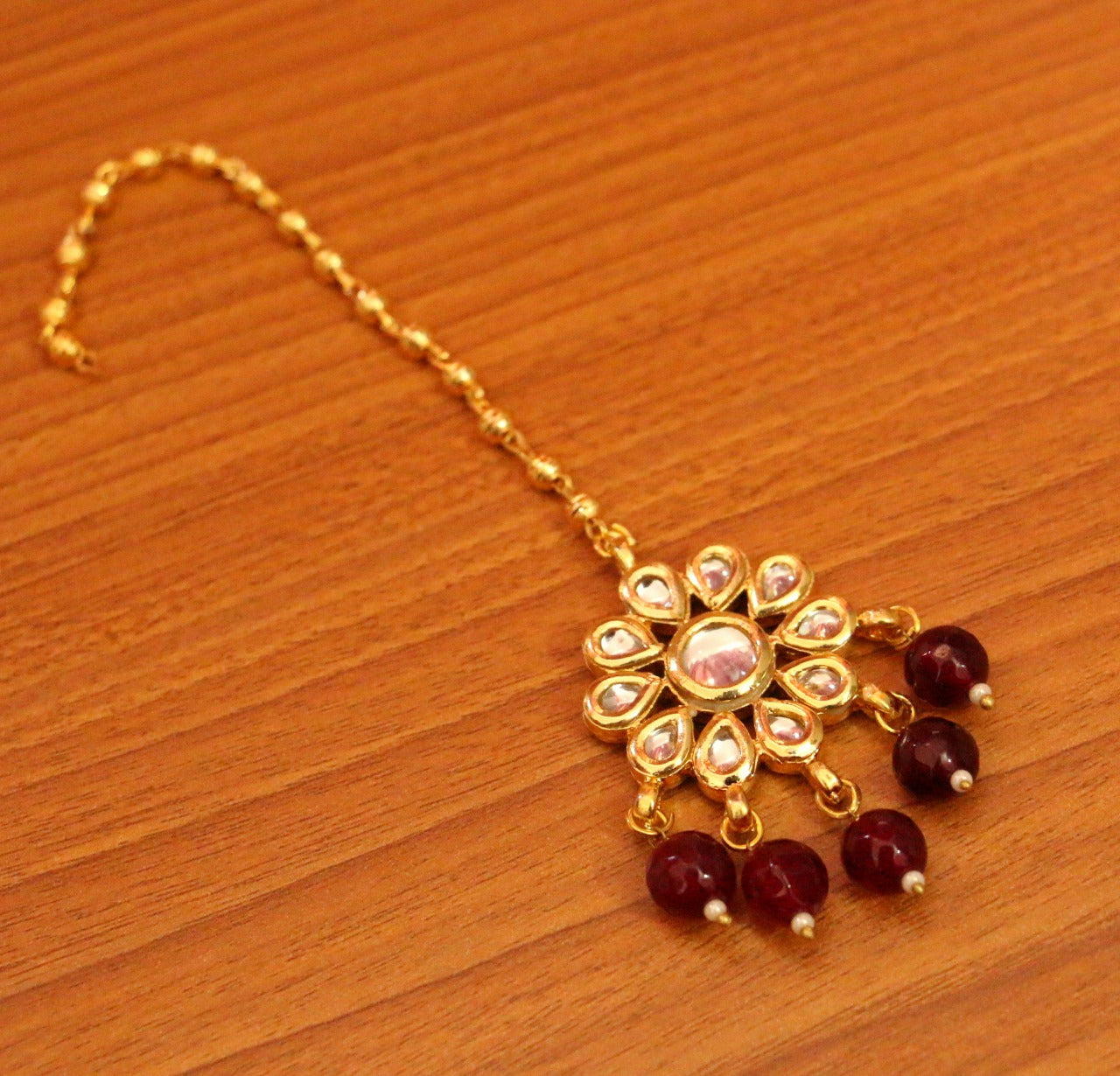 This kundan look maang tikka is handcrafted in silver alloy with imitation ruby colour quartz & kundan polki stones of very fine quality . This maang tikka is coated with gold rhodium plating as done on the real jewellery . The design itself looks very real and is perfect for wedding wear.