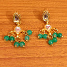 These kundan polki studs are handcrafted in brass alloy with imitation green colour pearls of very fine quality. these artistic yet modern studs are plated with high quality gold rhodium. the earrings are very light in weight.
