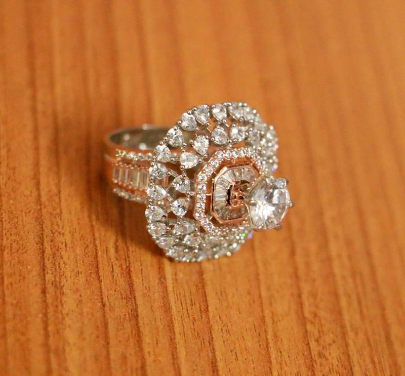 This Diamond Look Cocktail Ring Is Made In Silver Alloy With Fine Cubic Zirconia Stones And Is Plated With White Gold & Rose Gold Rhodium To Give It A Real Diamond Look .