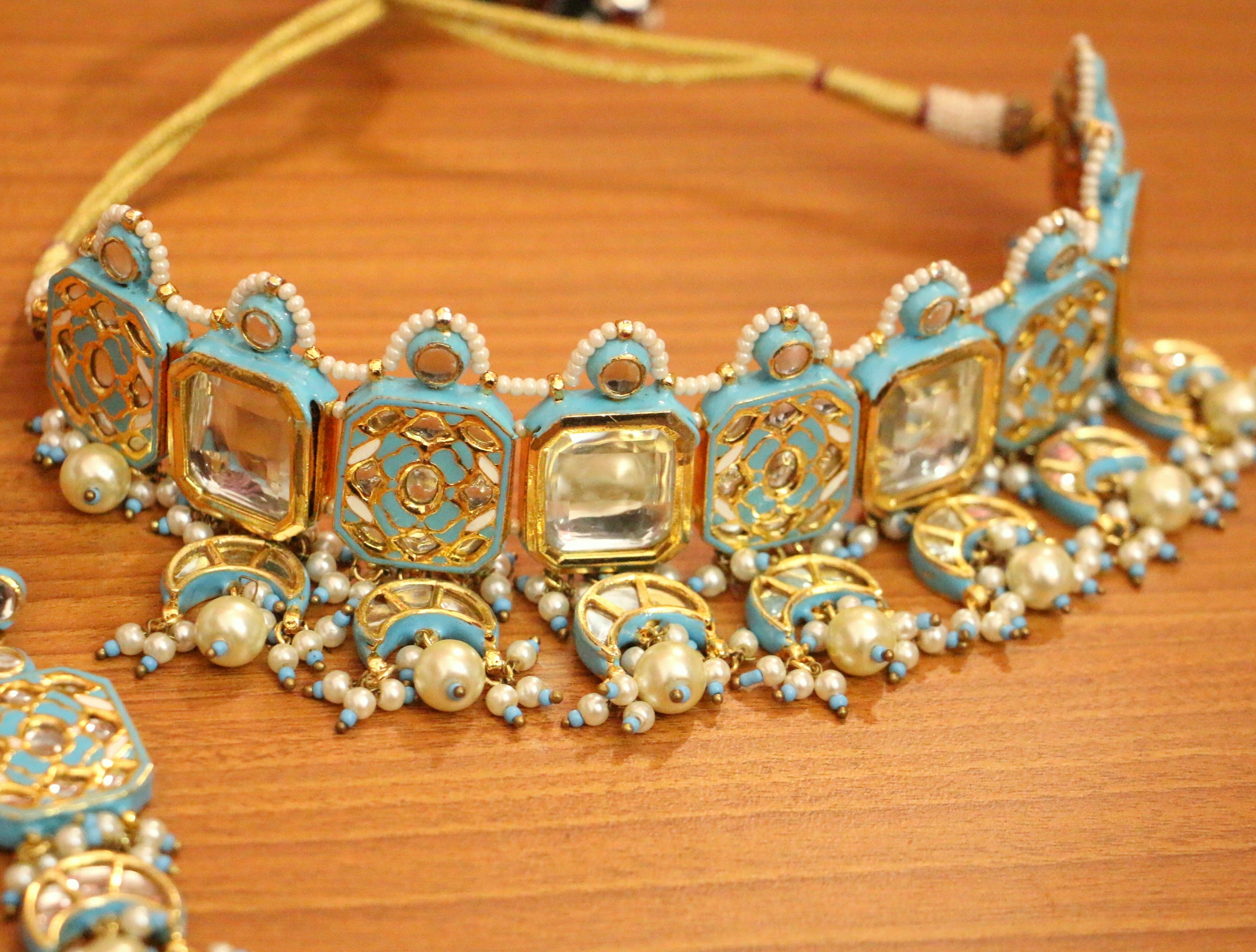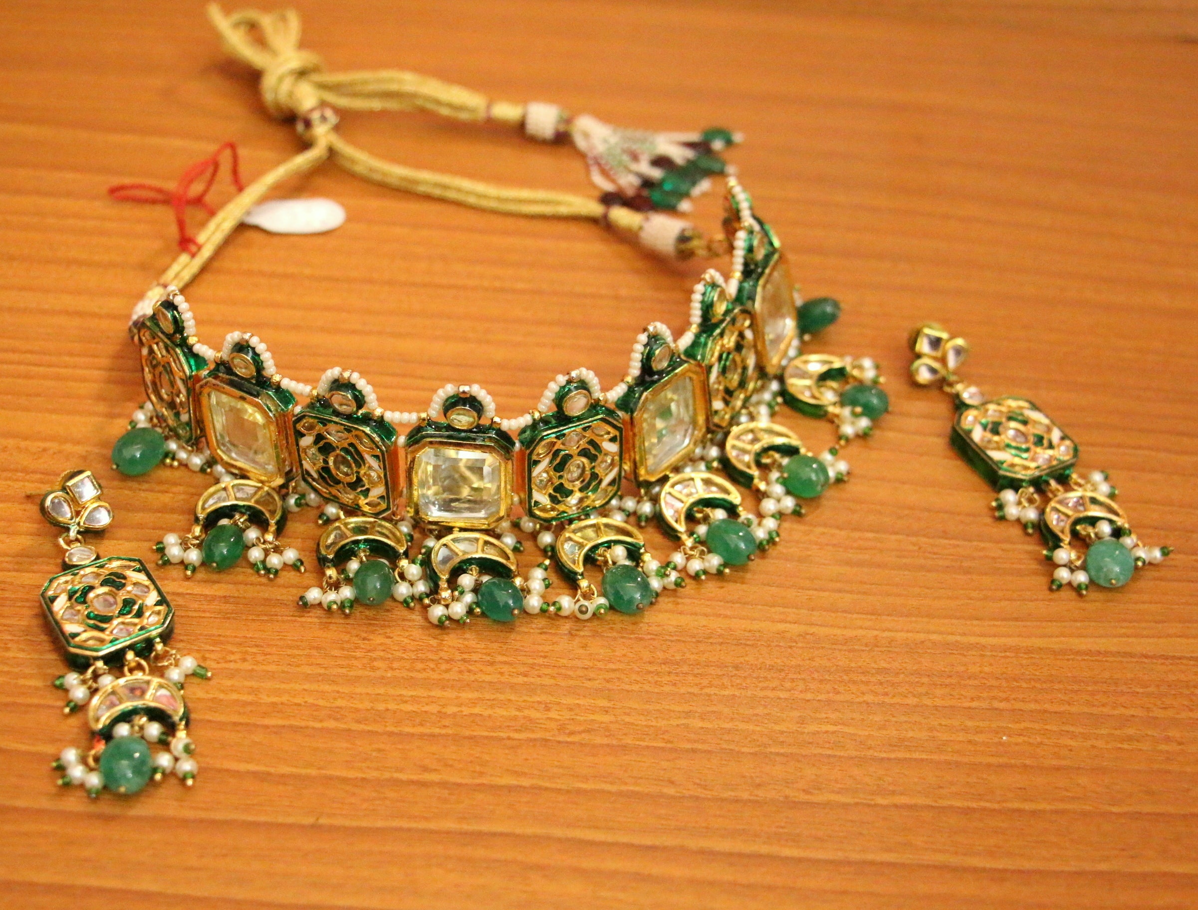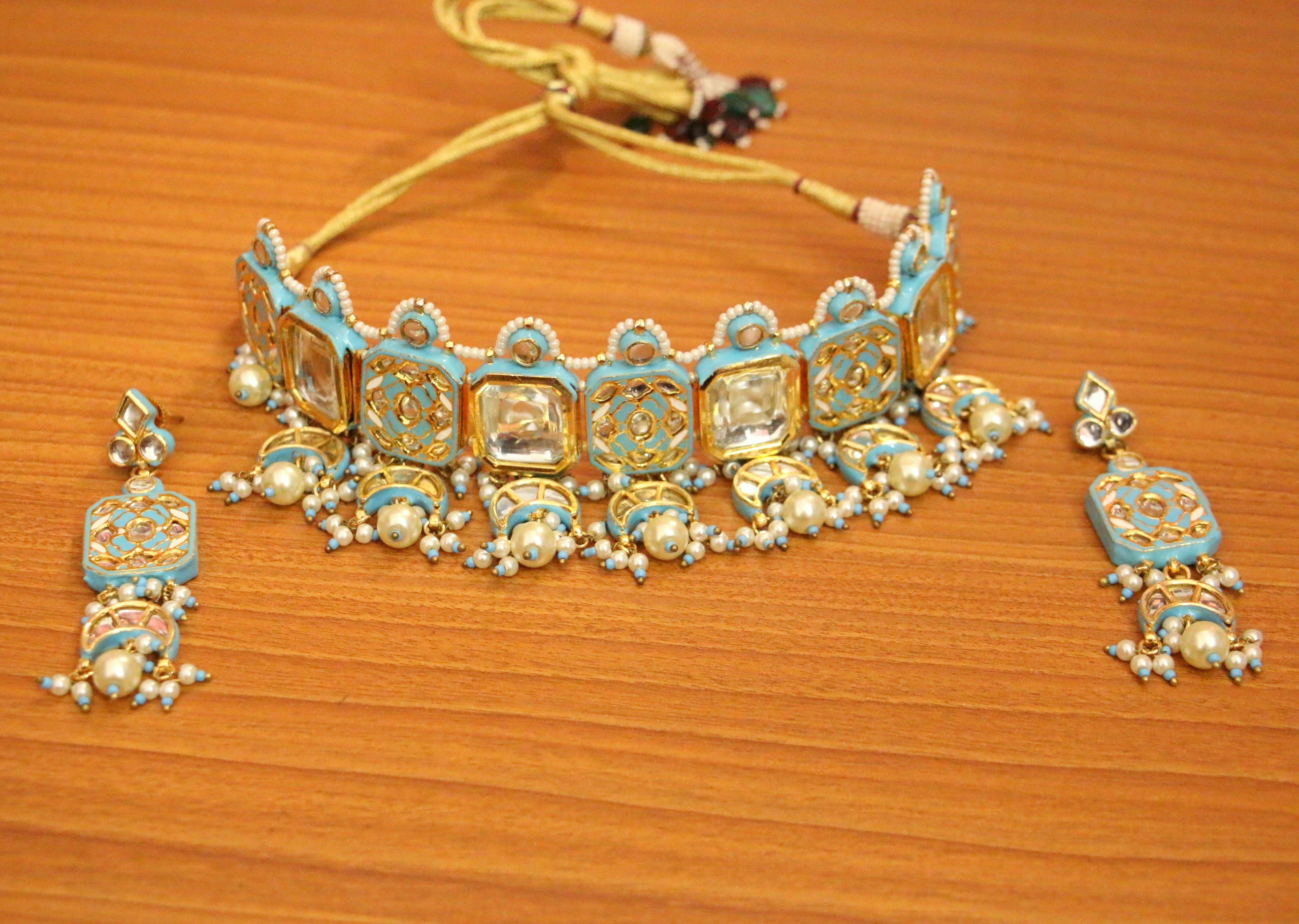 This kundan polki choker necklace set Is handcrafted in silver alloy with imitation kundan polki stone and semi precious bead & pearls. the necklace set is coated with 18kt gold plating and nickle free plating to avoid allergy to the skin.