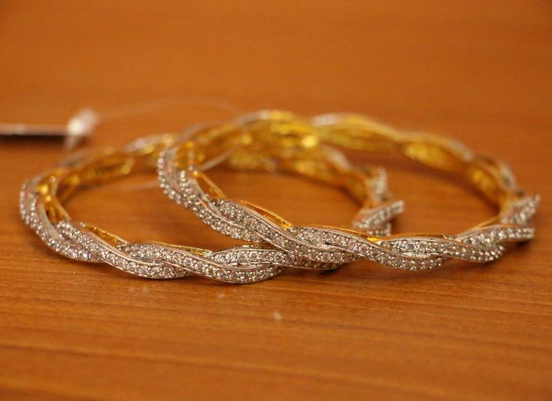 These beautiful pair of bangles are handcrafted in silver alloy with american diamond stones of very fine quality . These artistic yet modern bangles are plated with fine nickle free gold rhodium to avoid any allergies to the skin.