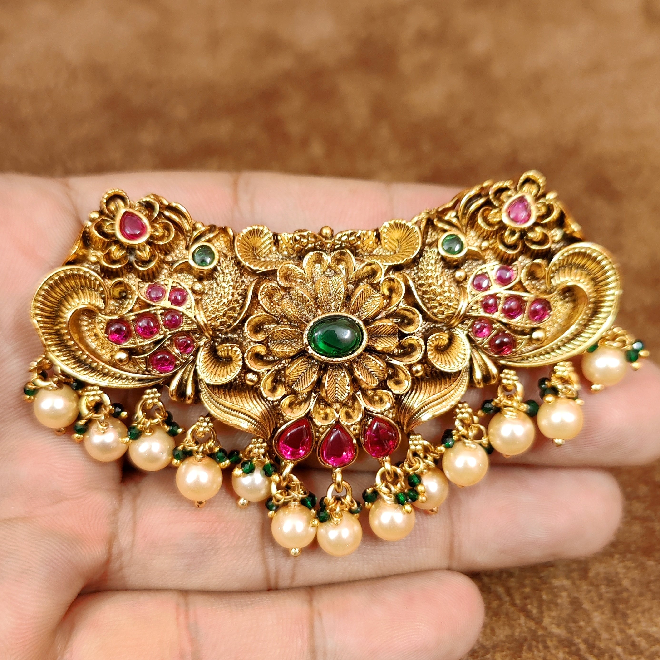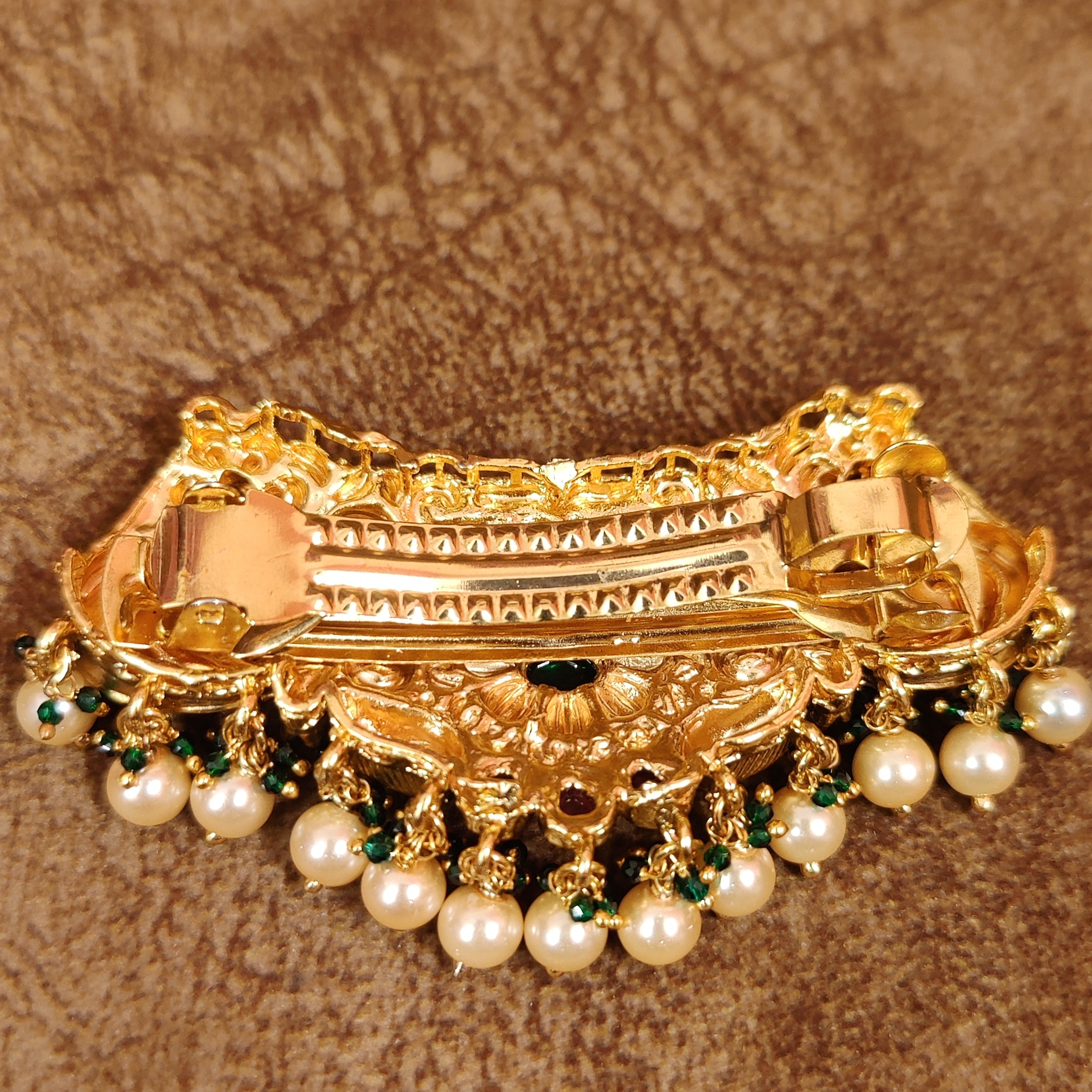 Add a regal charm to your hairstyle with this Ruby & Emerald Antique Gold Look Real Kemp Stone Hairclip. Designed with exquisite craftsmanship, this hair accessory features real Kemp stones in rich ruby and emerald hues, set in an antique gold-plated finish. The intricate detailing makes it a perfect match for traditional, bridal, and festive outfits. Secure yet stylish, this hairclip is a timeless piece that enhances your ethnic elegance effortlessly.
