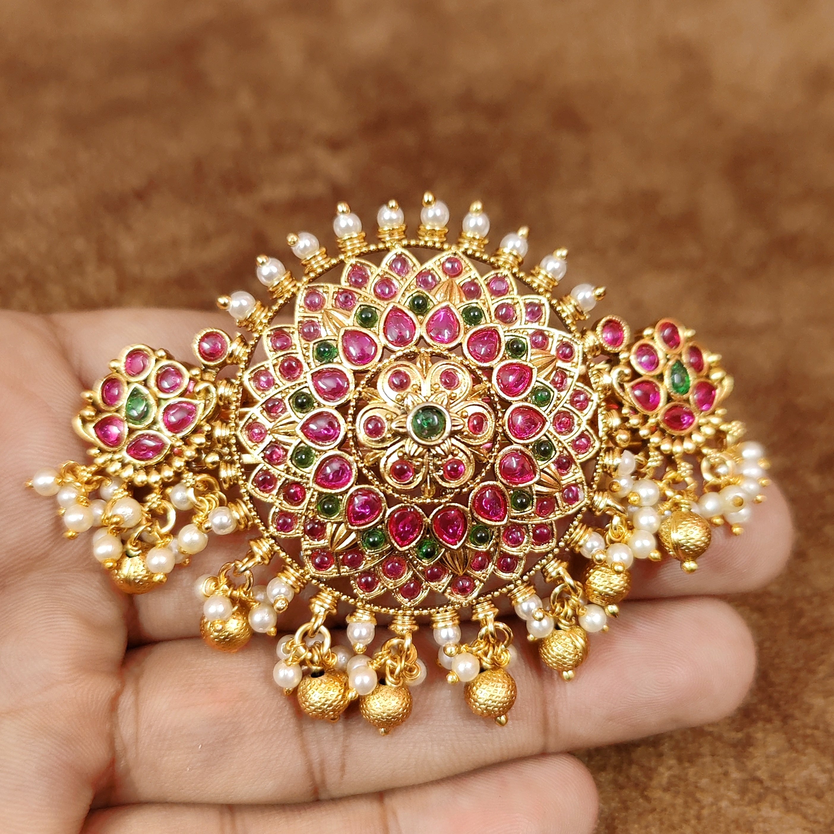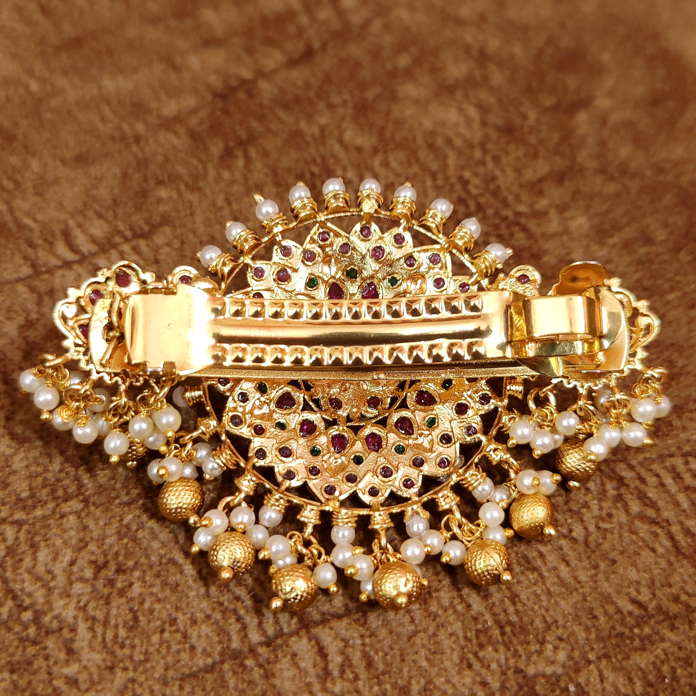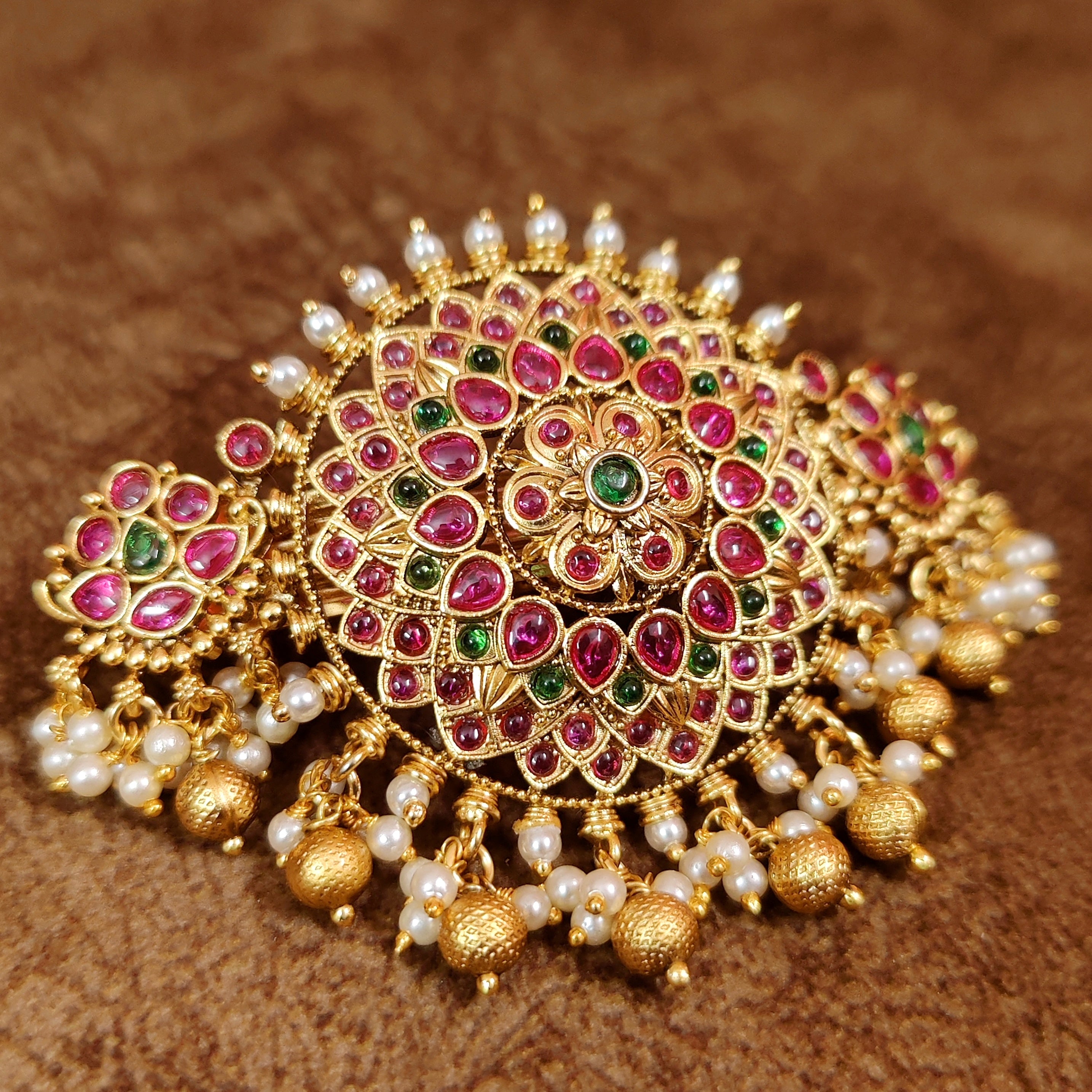 Add a touch of tradition and elegance with the Ruby & Emerald Real Kemp Stone Ethnic Hairclip. Featuring genuine Kemp ruby and emerald stones set in an antique gold-plated finish, this hair accessory is a perfect blend of heritage and sophistication. Designed to complement ethnic and bridal attire, it ensures a secure hold while enhancing your hairstyle with a regal charm.