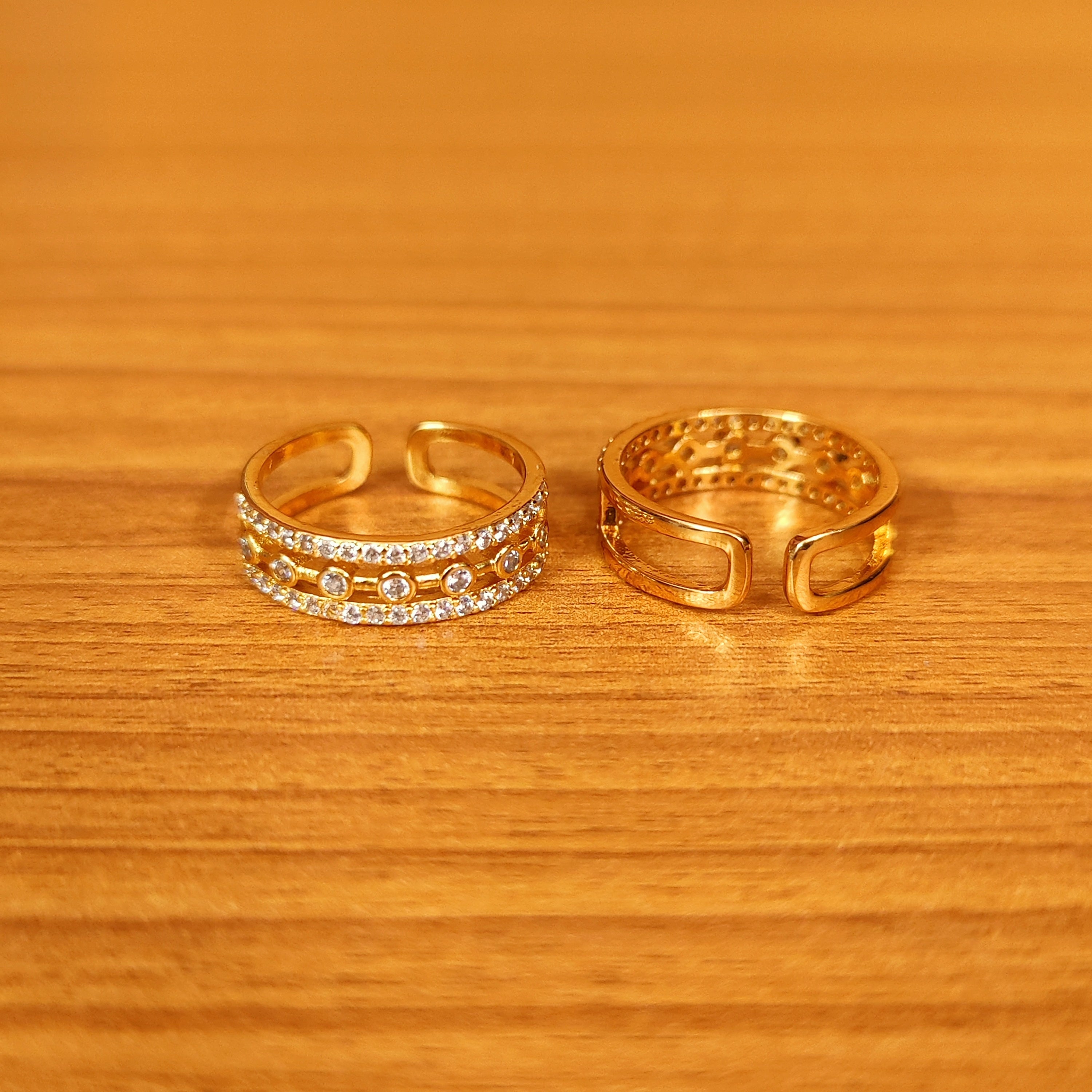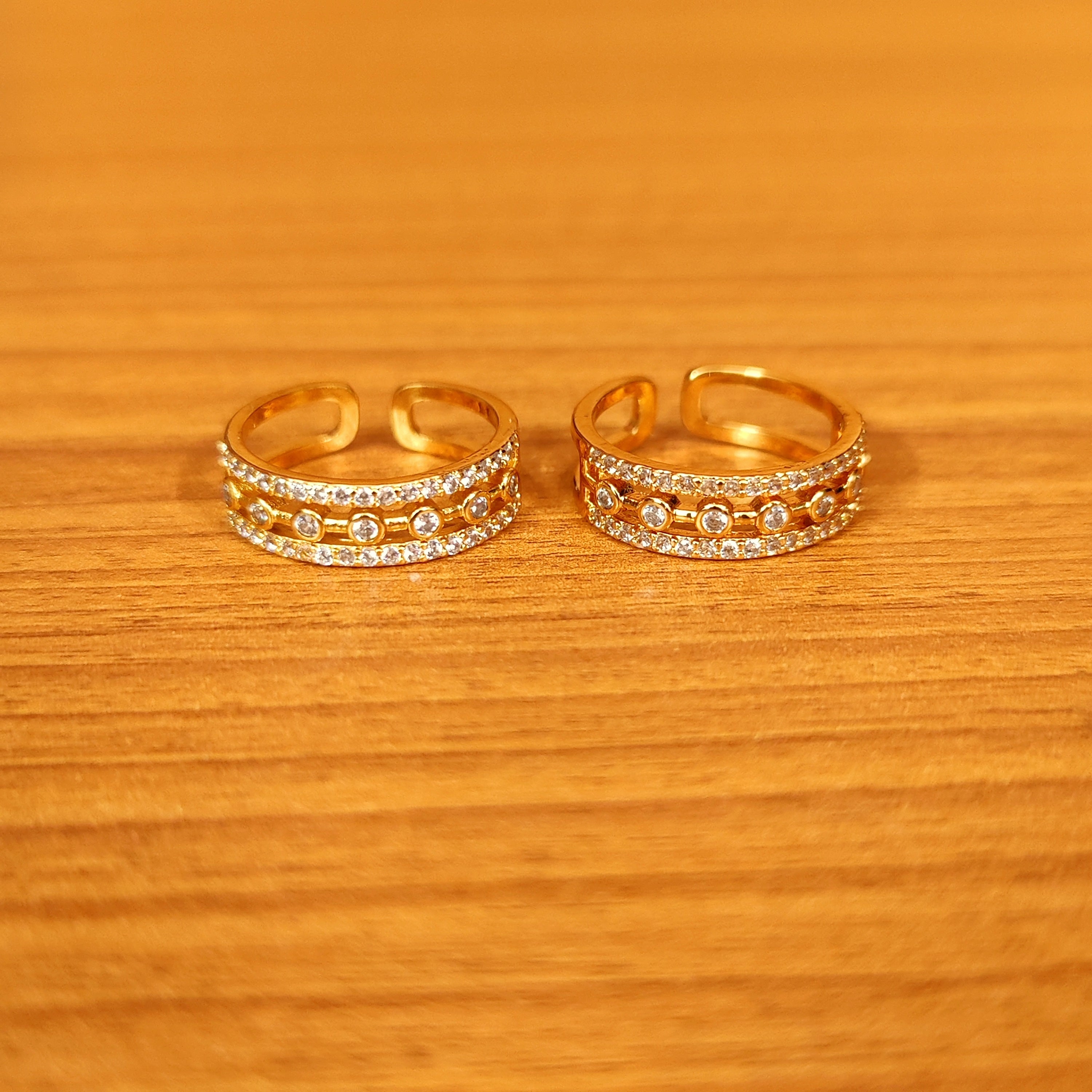 These gold look toe rings are made in silver and brass alloy with imitation american diamond stones of very fine quality. These cute toe rings are handcrafted to perfection with high quality finish as seen in real diamond jewellery and are plated with 18kt nickle free gold rhodium that gives the design a real look.