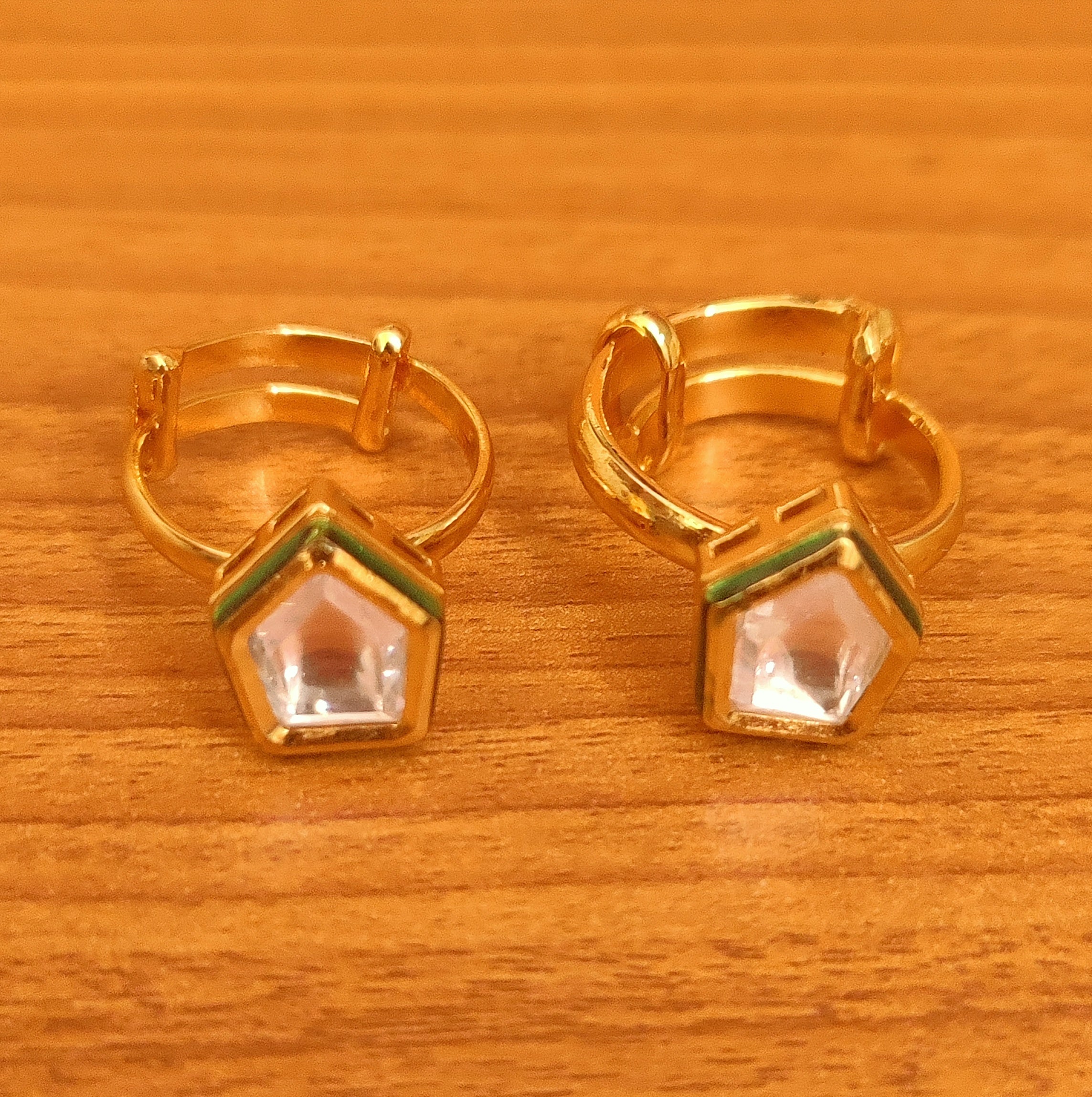This beautiful toering is handcrafted in brass alloy with imitation cz stone and kundan work of very fine quality , this toering is coated with 18 kt nickle free gold plating to avoid skin allergies and its very light in weight .