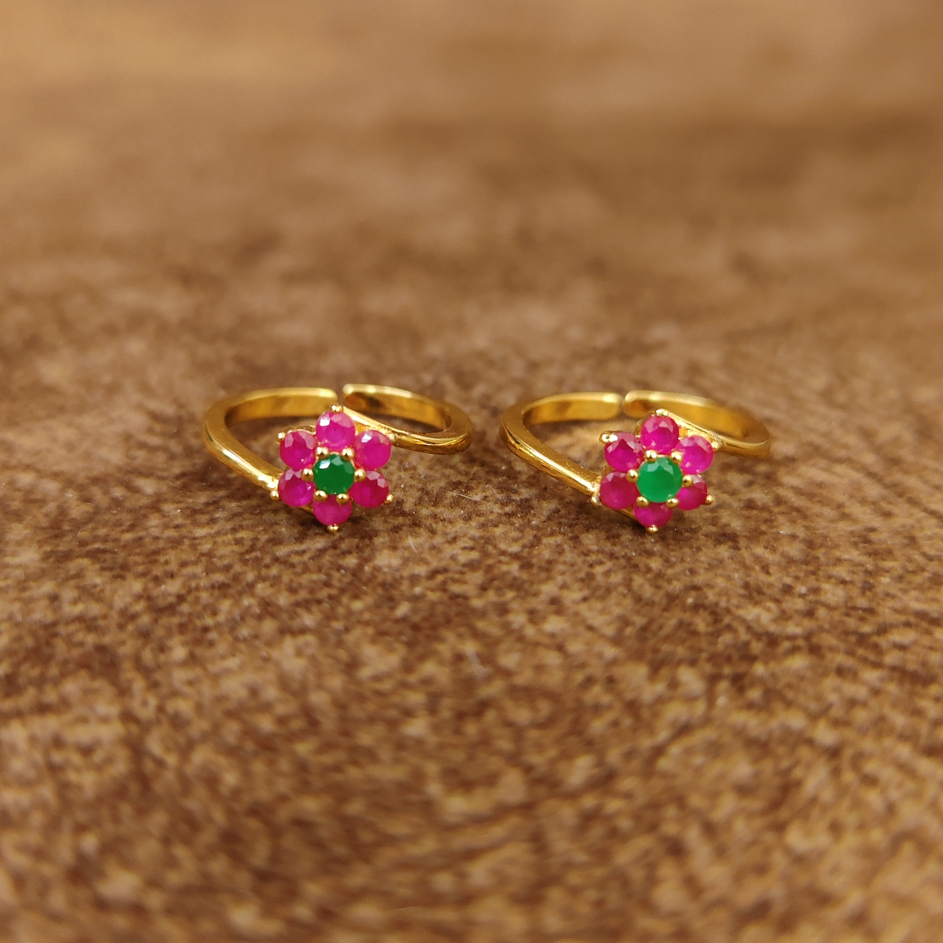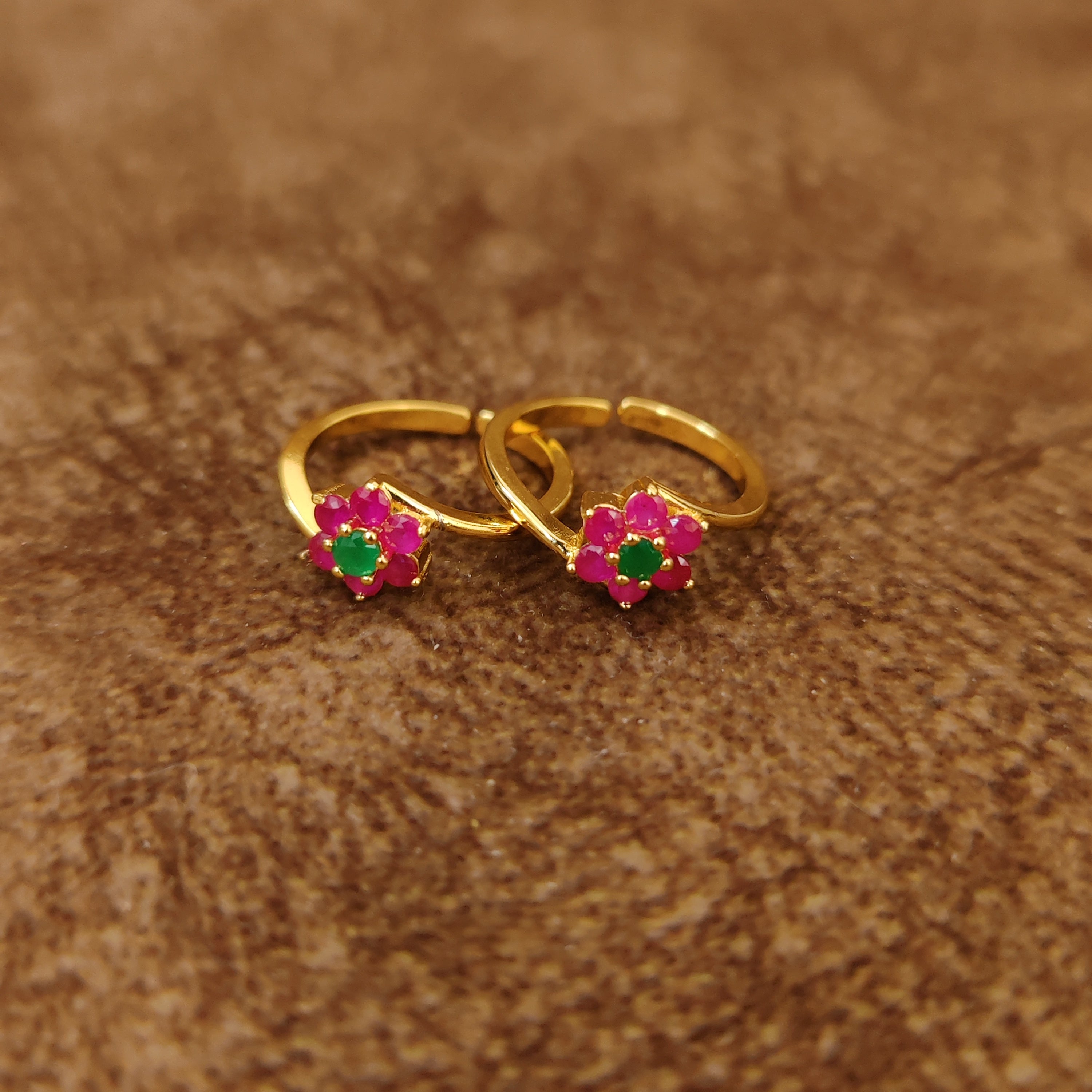 Enhance your style with these Ruby & Emerald Look Gold Plated Toe Rings. Designed with vibrant ruby and emerald-like stones set in a rich gold-plated finish, these adjustable toe rings add a regal charm to your look. Perfect for daily wear or festive occasions, they make a stunning addition to any jewelry collection.