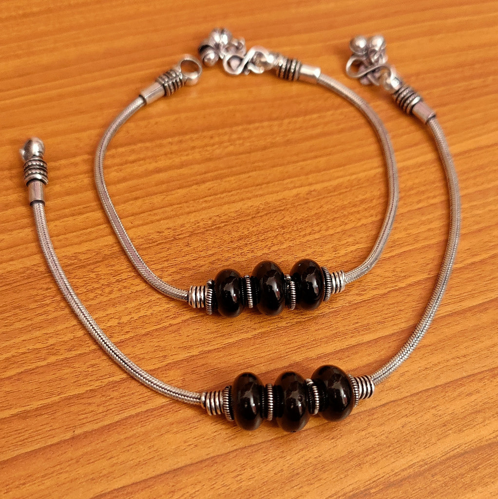 OXIDISED SILVER LOOK BLACK BEADS ANKLETS