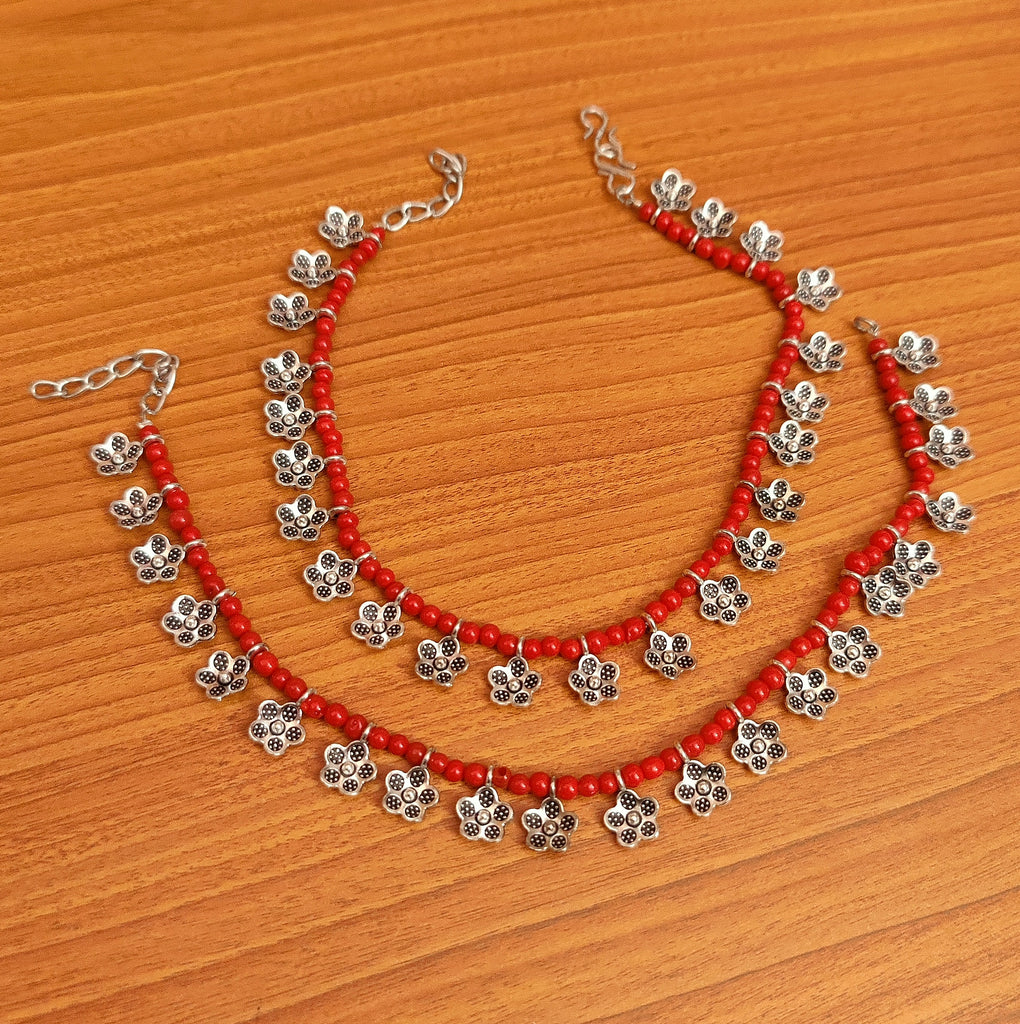 CORAL BEADS OXIDISED FLOWER PATTERN ANKLETS