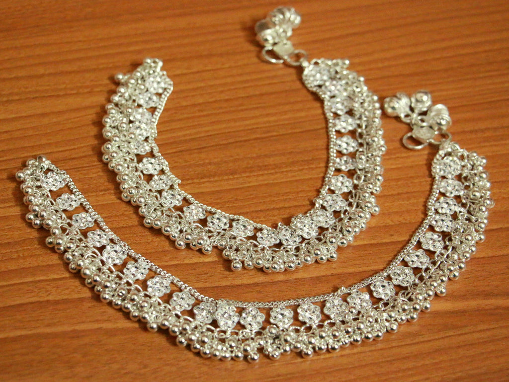 Flower Pattern Zircon Studded Silver Plated Anklets