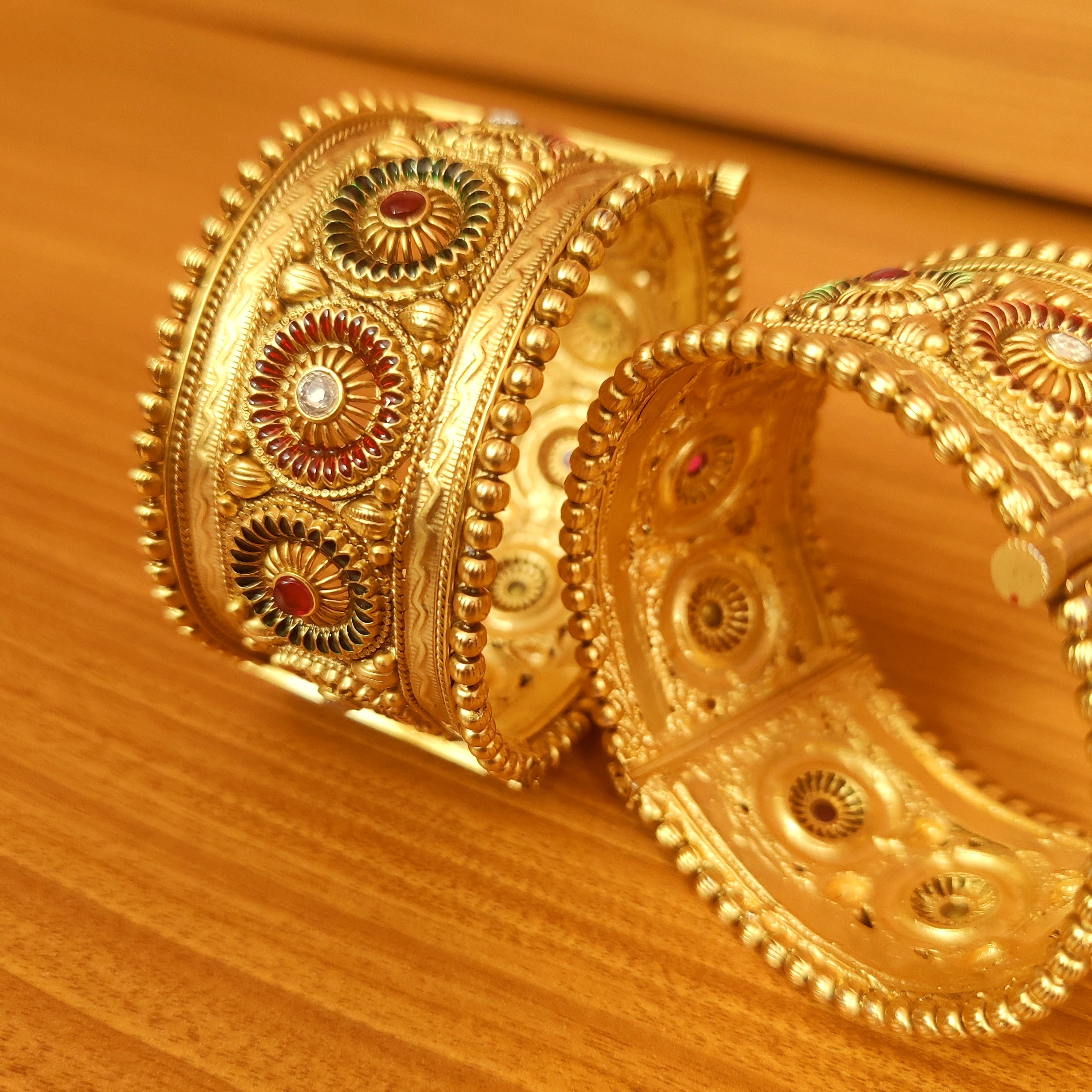 These beautiful antique gold bangles are handcrafted in copper alloy with imitation white & red colour kempu stones with red & green meenakari work of very fine quality. These bangles are coated with 22 kt antique gold plating that gives a real look to the design and these openable bangles comes with a set of 2 bangles.