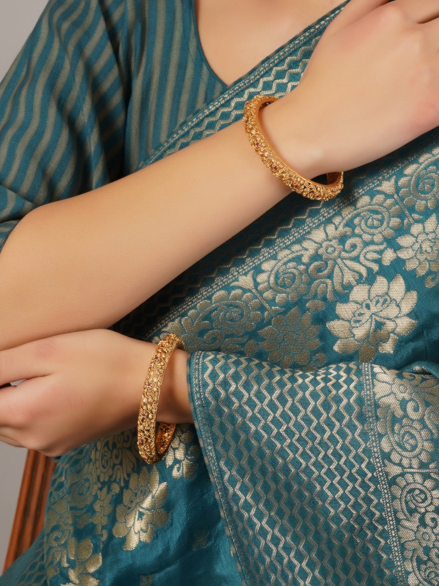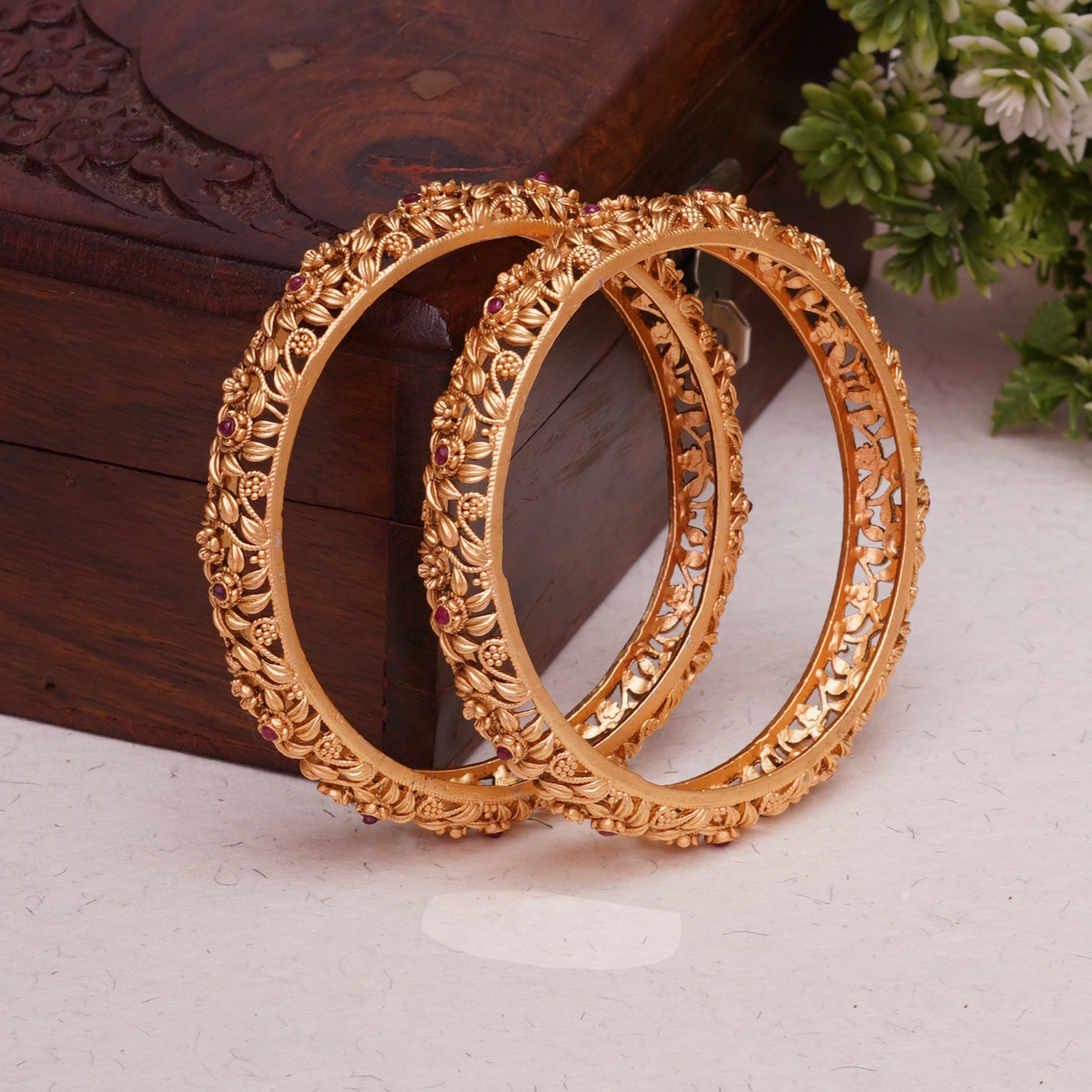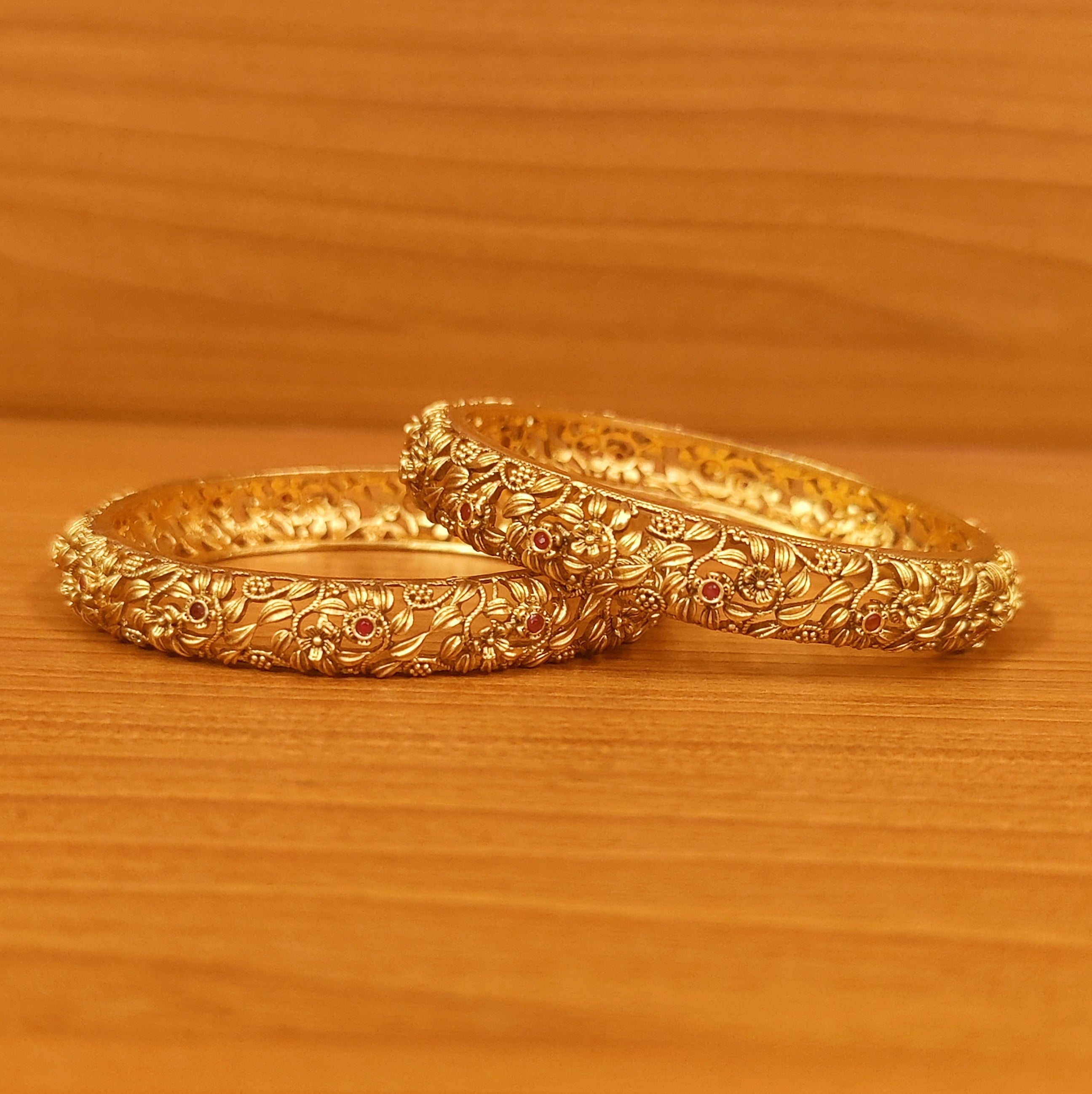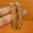 These beautiful matt gold bangles are handcrafted in copper alloy with imitation ruby colour stone with hand graved carving work of very fine quality. These bangles are coated with 18 kt matt gold rajwadi plating that gives a real look to the design, these bangles comes in a pair of two and are perfect for party wear.