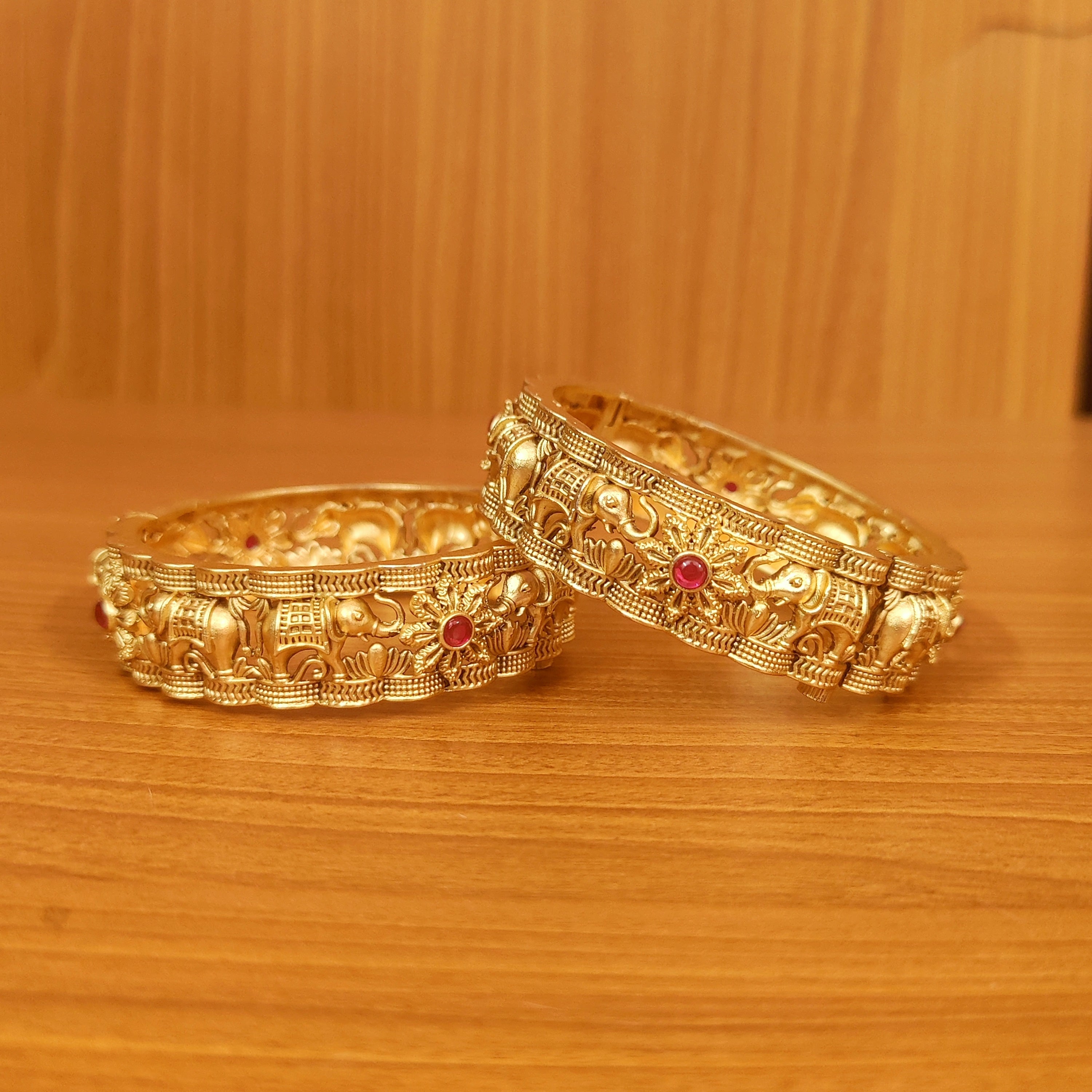 These beautiful matt gold bangles are handcrafted in copper alloy with imitation red colour kempu stones with fine elephant, flower motifs and intricate small gold details as seen in real gold bangles. These bangles are coated with 22 kt gold rajwadi plating that gives a real look to the design and these openable bangles comes with a set of 2 bangles.