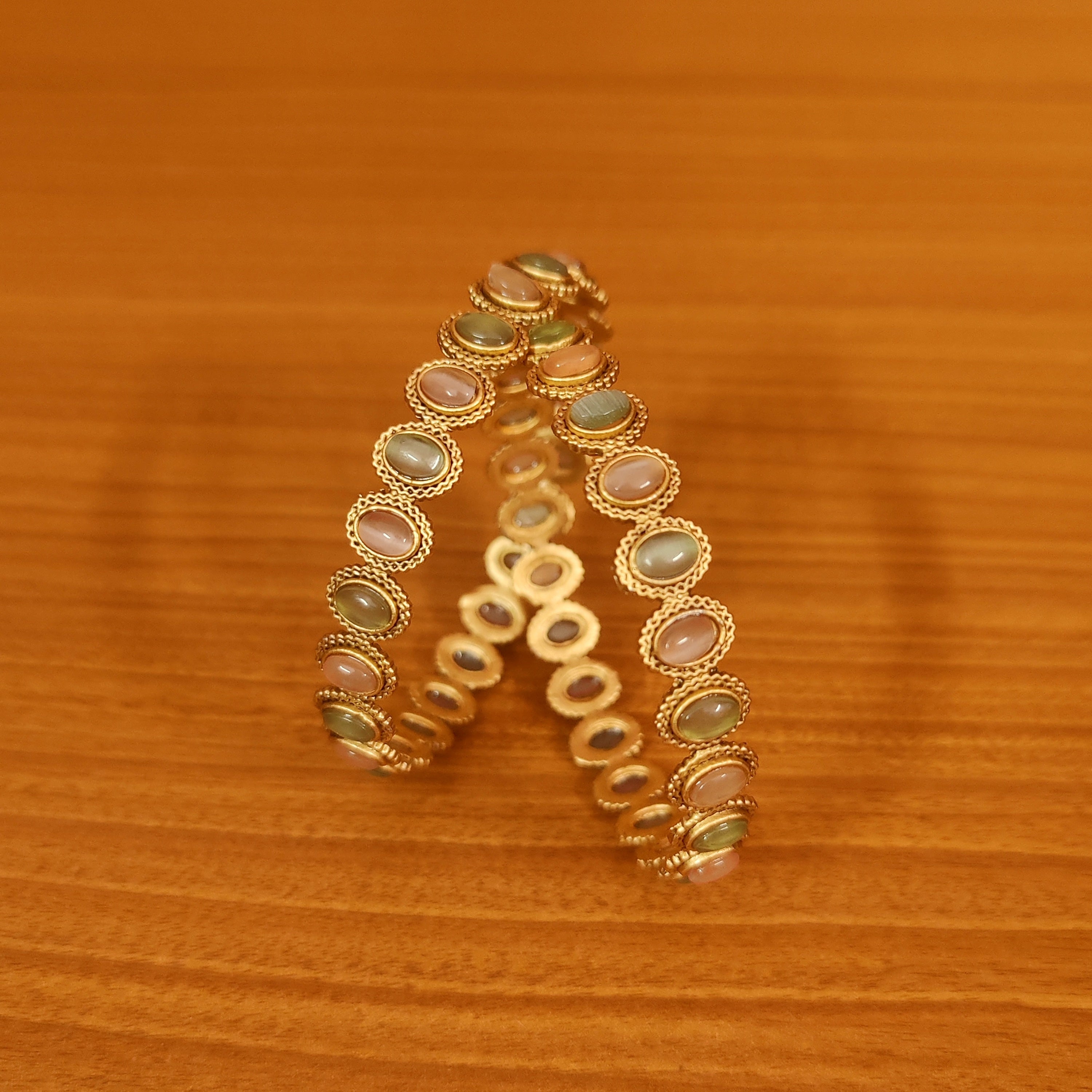 These beautiful royal matt gold bangles are handcrafted in copper alloy with imitation mint green & pink colour stones of very fine quality. These bangles are coated with 22 kt matt gold rajwadi plating that gives a real look to the design and these bangles comes with a set of 2 bangles.