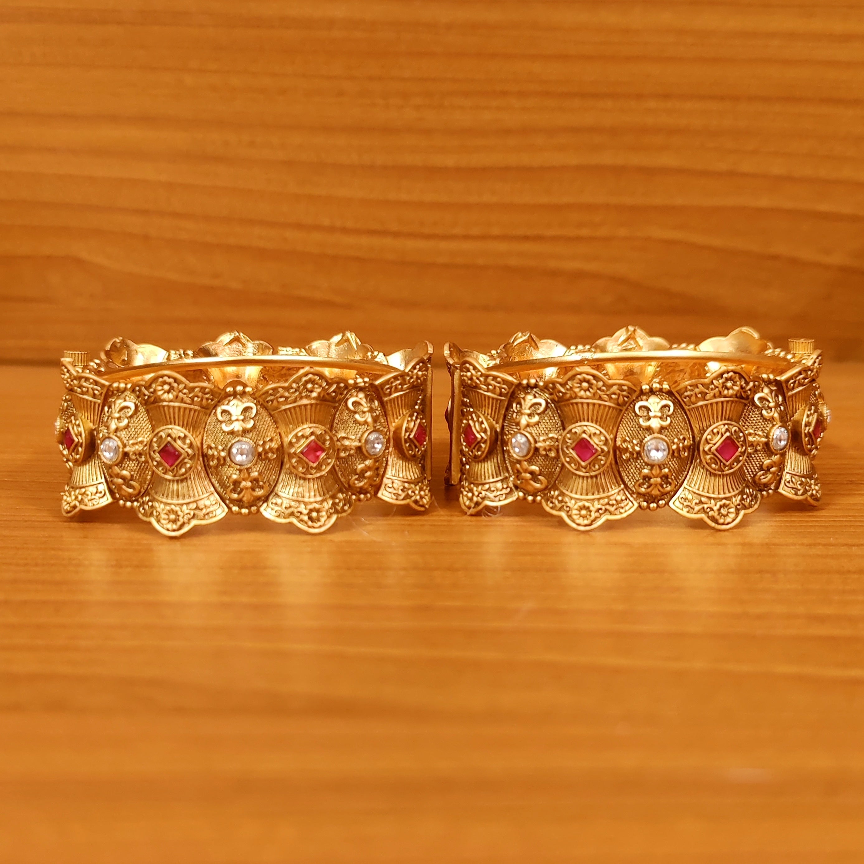These beautiful antique gold bangles are handcrafted in copper alloy with imitation red colour stones , kundan polki stones and intricate hand carved work of very fine quality. These bangles are coated with 22 kt matt gold plating that gives a real look to the design , these bangles are very light in weight and comes as a set of 2 bangles. Bangles are openable.
