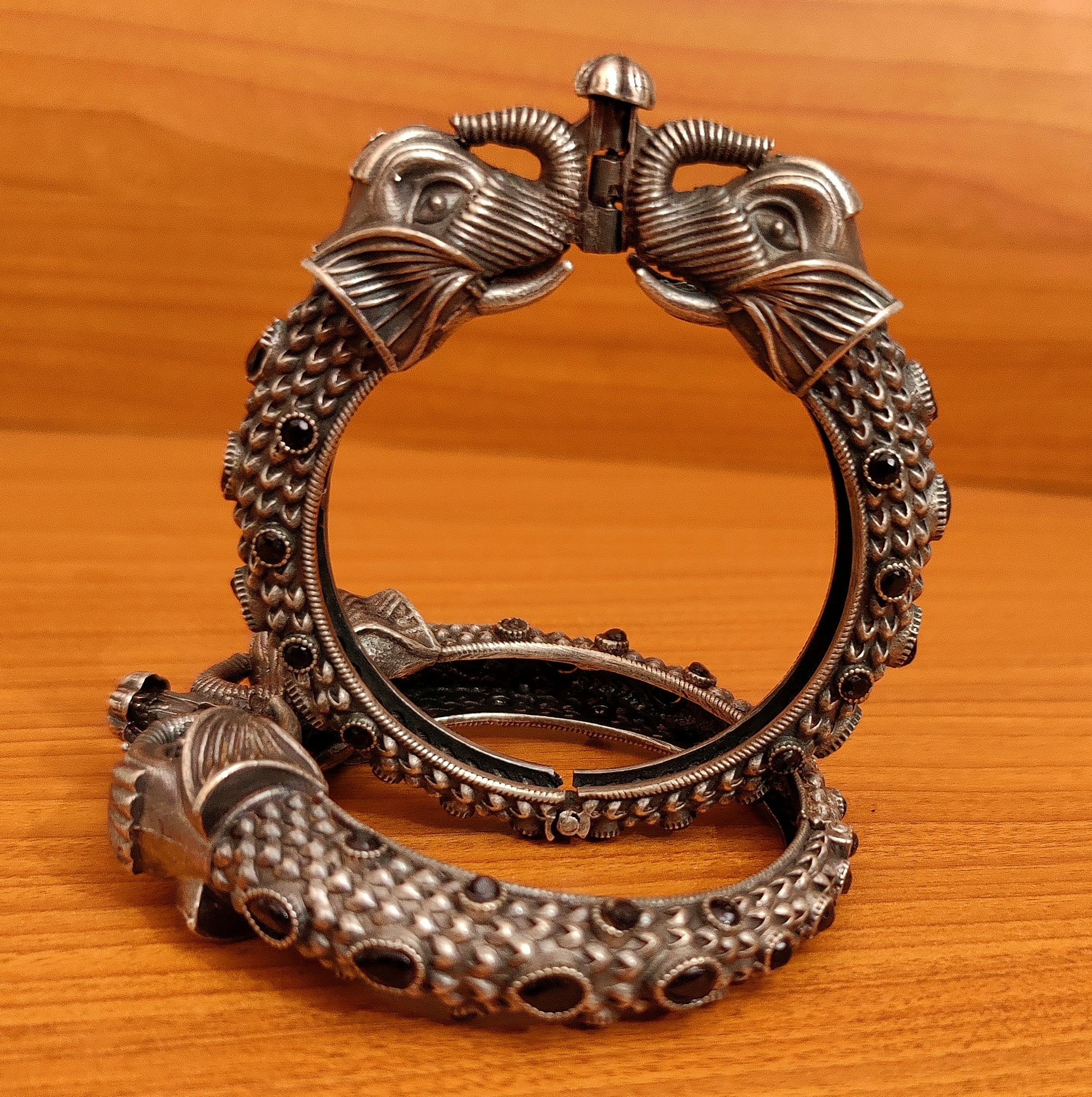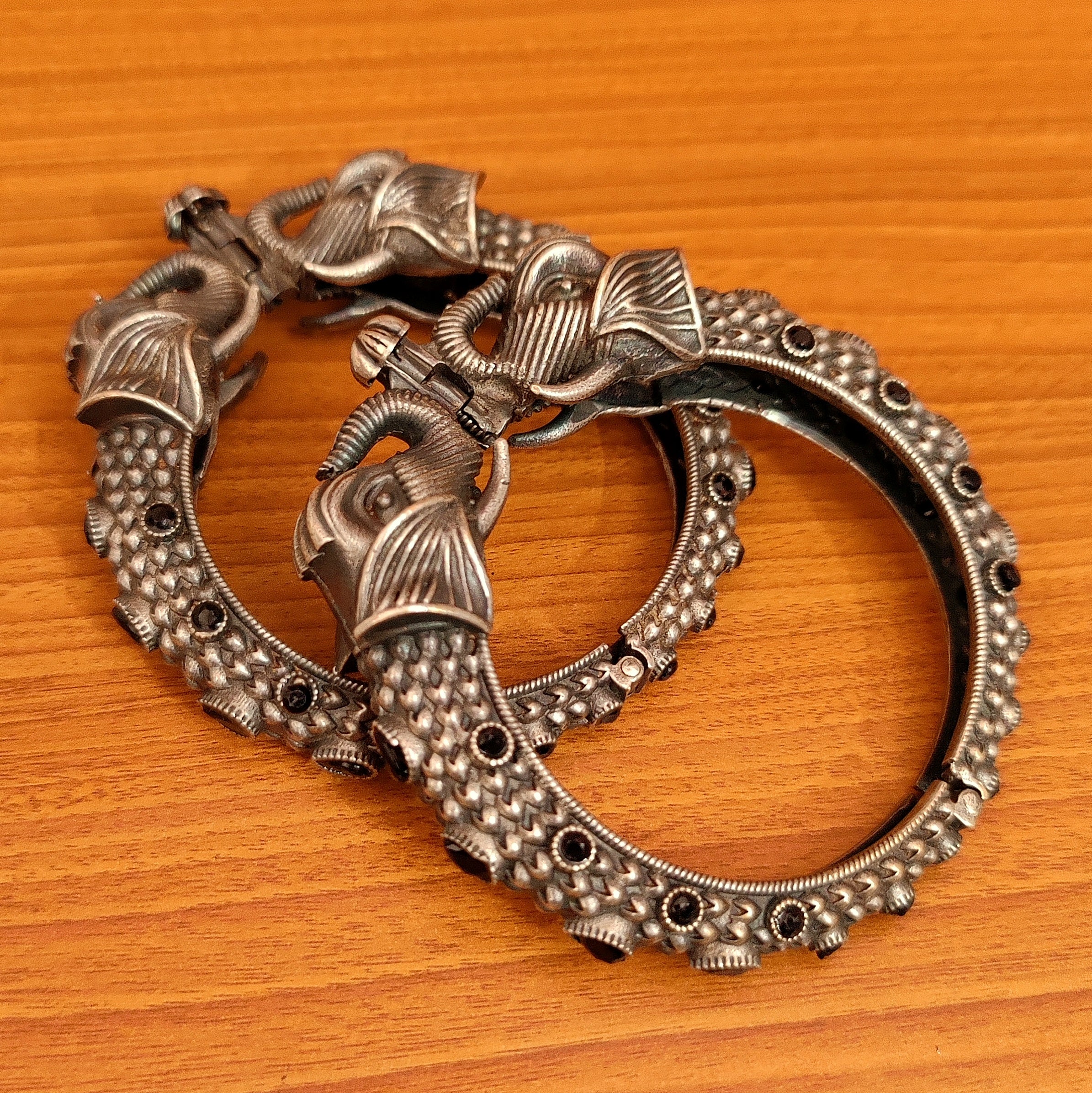 These elephant pattern bangles are handcrafted in metal alloy with imitation black colour stone & silver plated of very fine quality. These artistic yet modern bangles are plated with fine nickle free silver rhodium to avoid any allergies to the skin.