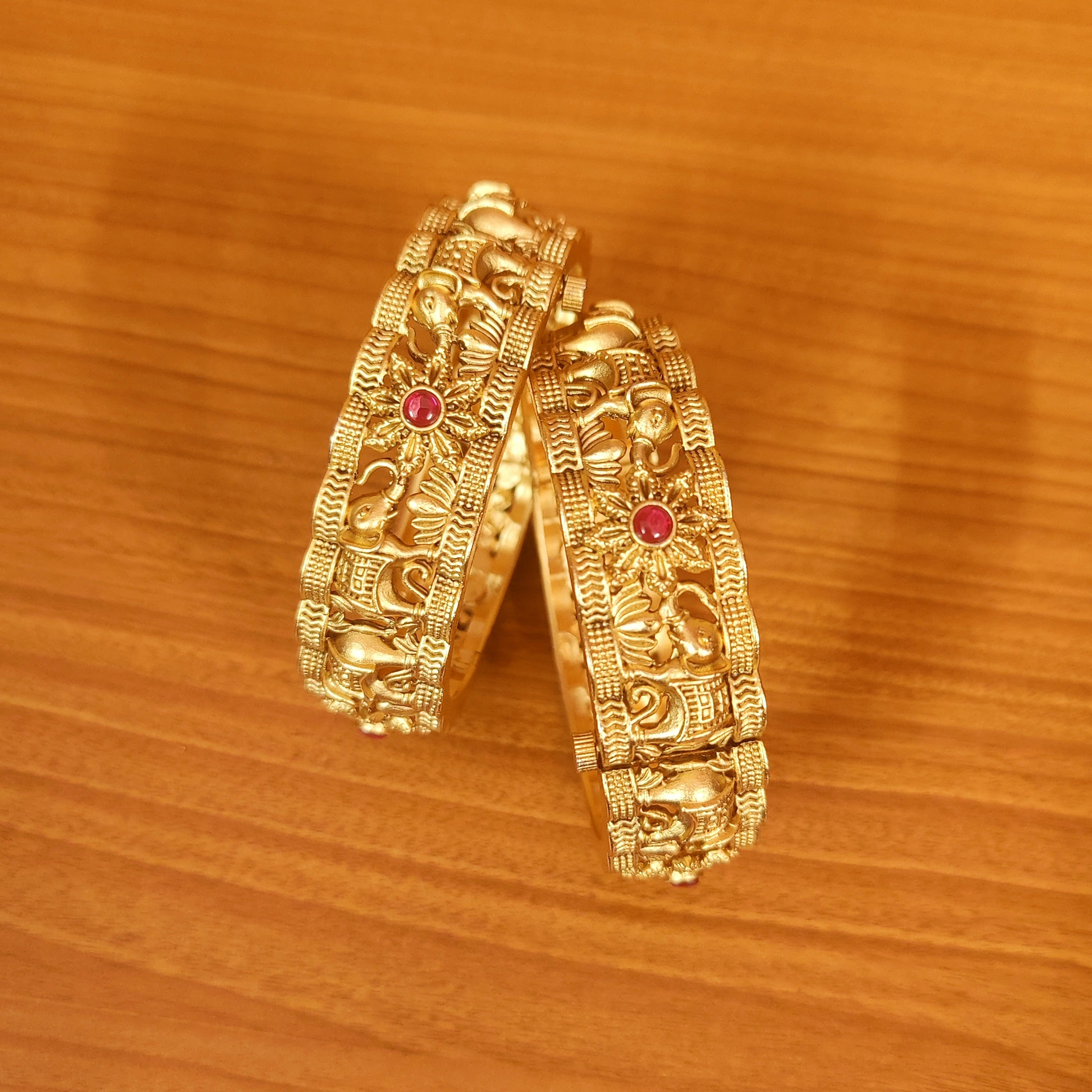 These beautiful matt gold bangles are handcrafted in copper alloy with imitation red colour kempu stones with fine elephant, flower motifs and intricate small gold details as seen in real gold bangles. These bangles are coated with 22 kt gold rajwadi plating that gives a real look to the design and these openable bangles comes with a set of 2 bangles.
