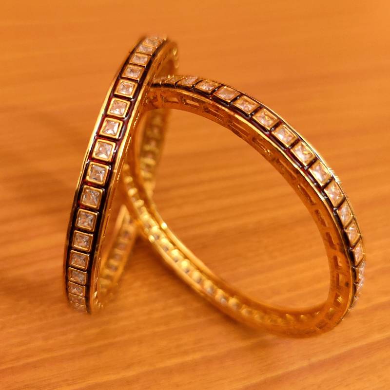 These bangles are handcrafted in copper alloy with imitation zircon & red colour meenakari work of very fine quality. These artistic yet modern bangles are plated with fine nickle free gold rhodium to avoid any allergies to the skin.