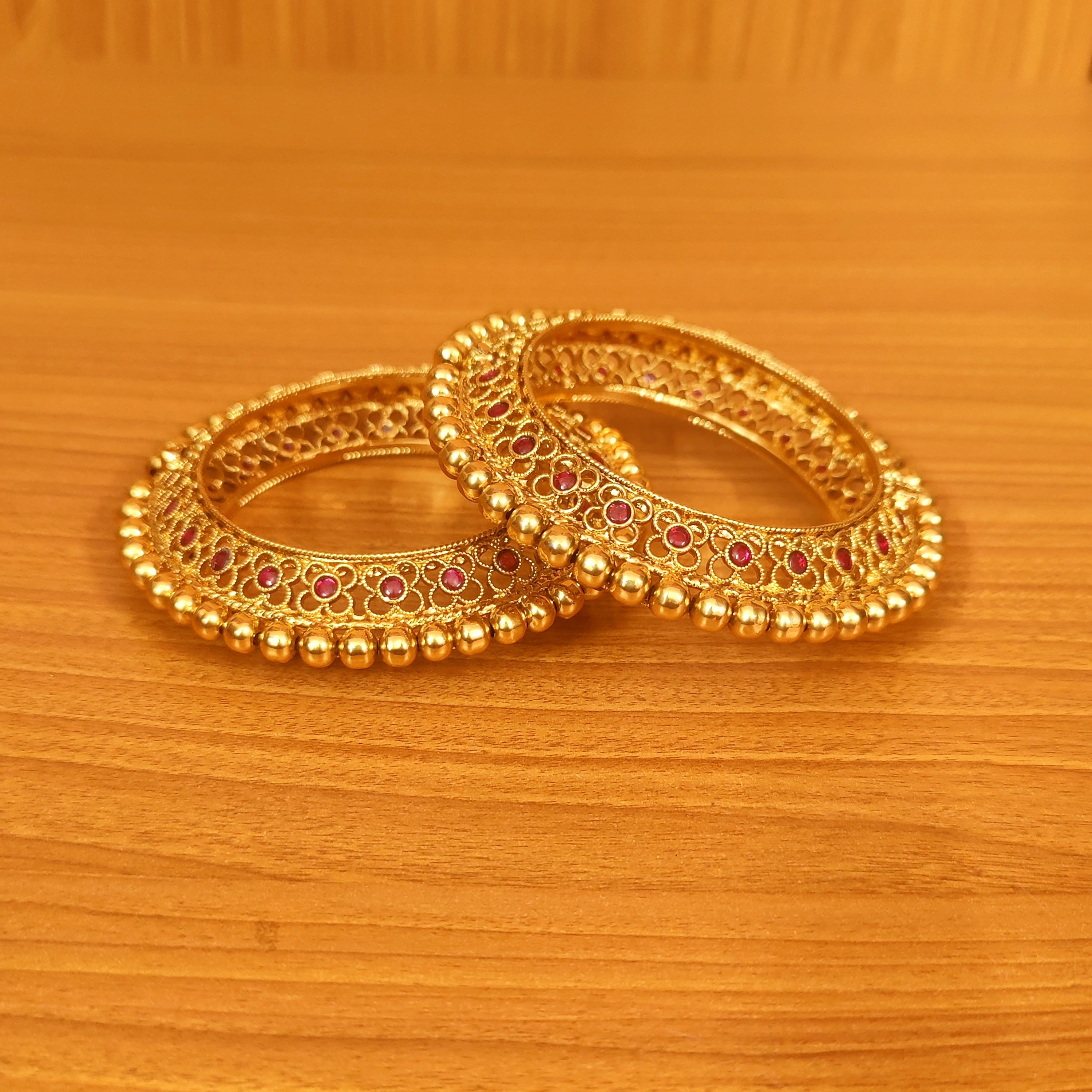 These beautiful pacheli gold bangles are handcrafted in copper alloy with imitation red colour kempu stones with flower motifs and intricate small gold details as seen in real gold bangles. These bangles are coated with 22 kt gold plating that gives a real look to the design and these openable bangles comes with a set of 2 bangles.