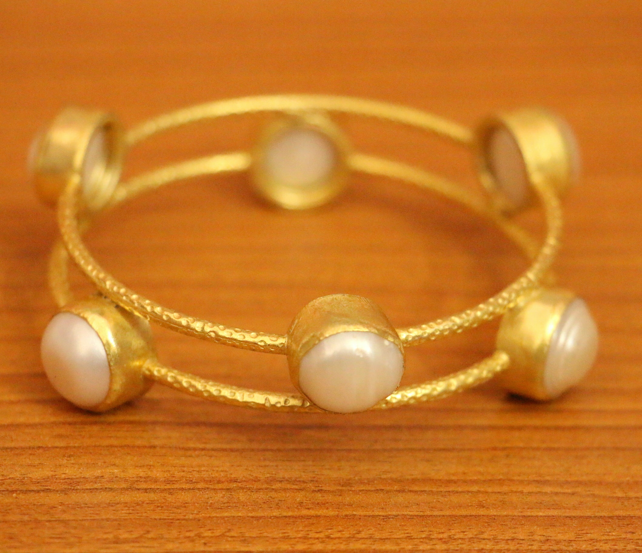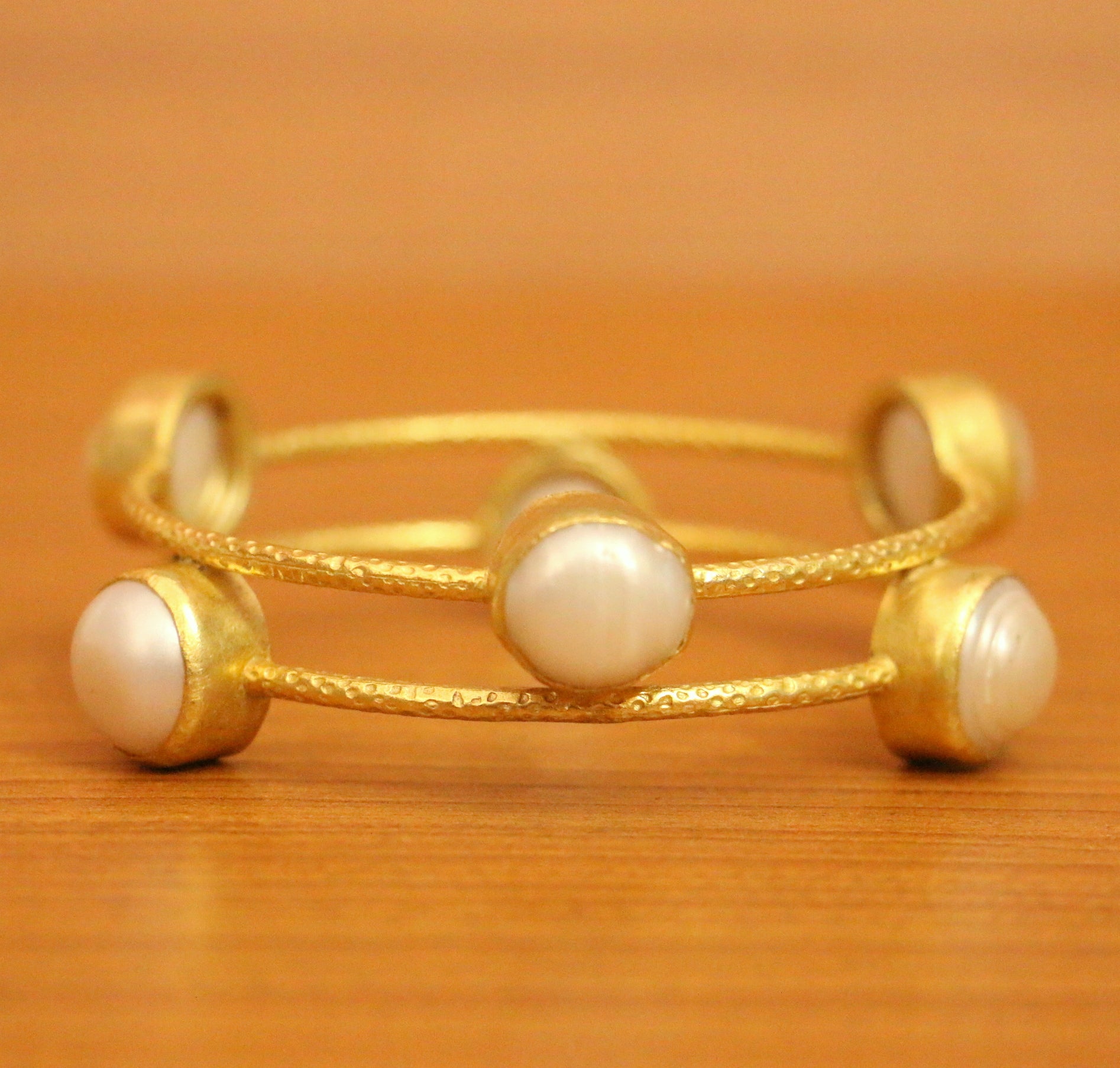 This beautifulbangle handcrafted in silver alloy with real natural pearls of very fine quality . This bangle is coated with 18 kt gold polish which give them a unique look . An absolutely stunning piece to own and are very light in weight.