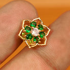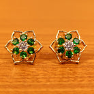 These beautiful flower pattern studs are handcrafted in brass alloy with imitation green colour stone & cz stone work of very fine quality. these artistic yet modern earrings are plated with high quality gold rhodium. the earrings are very light in weight.