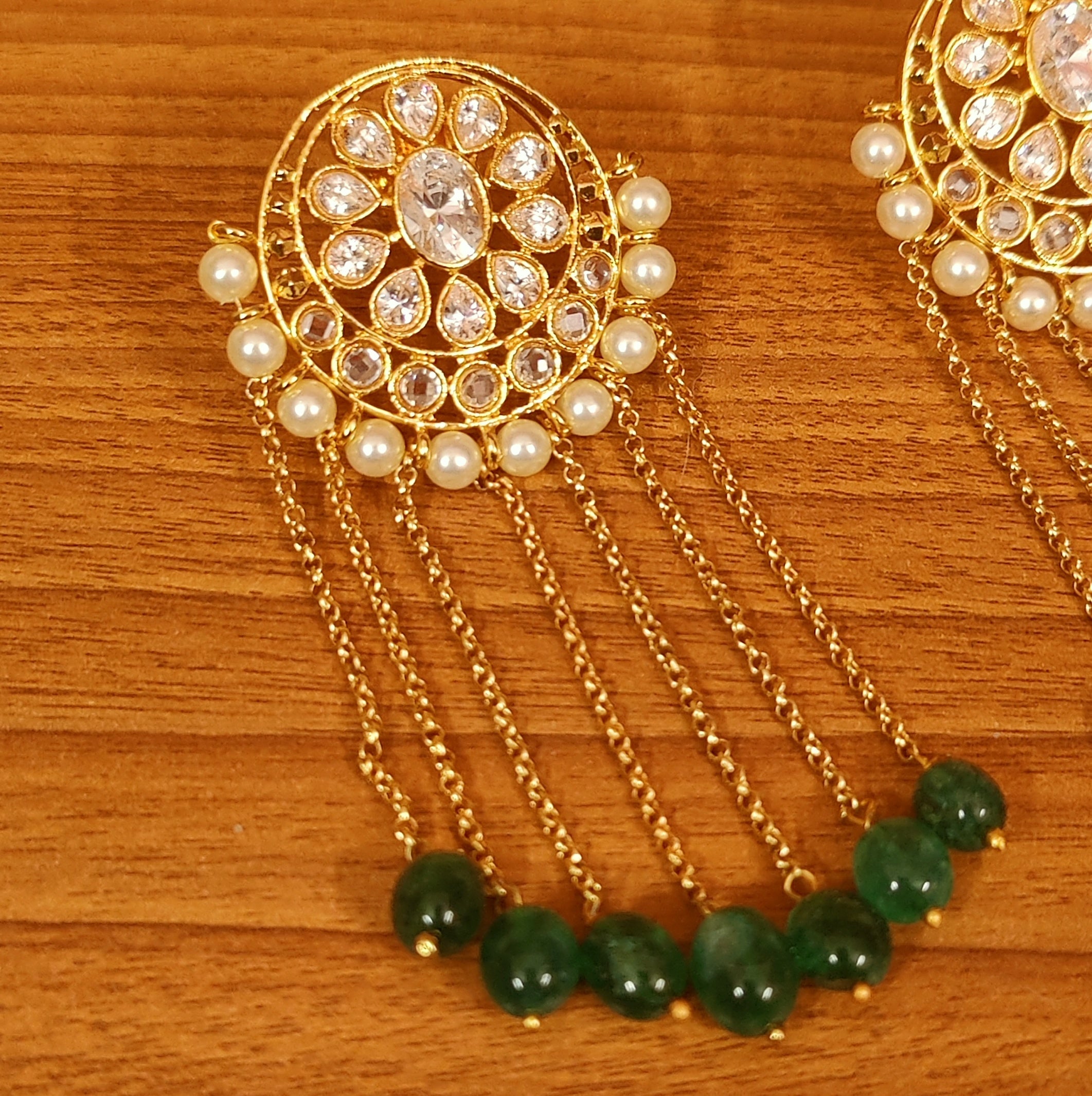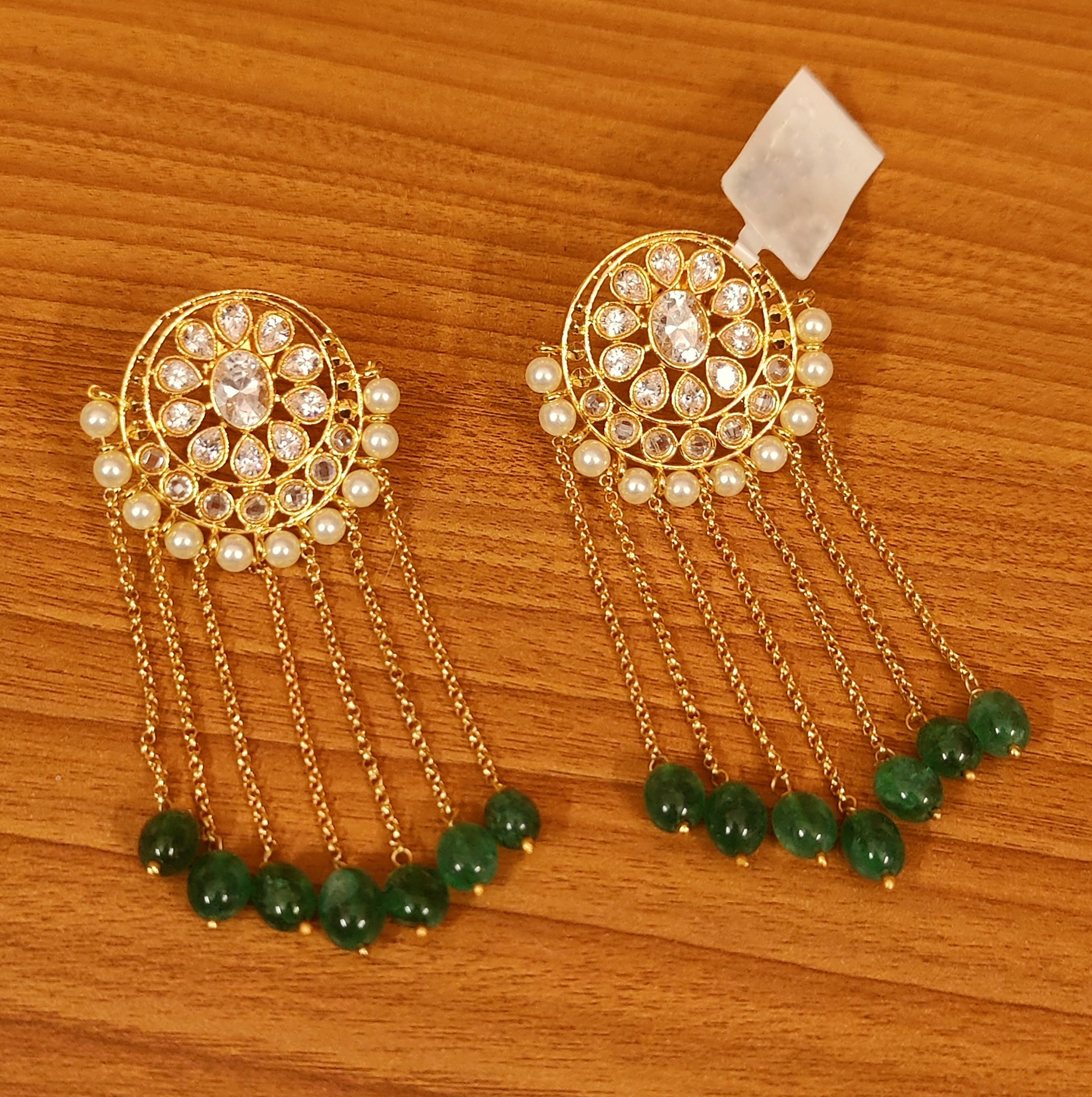 These emerald look chain earrings are handcrafted in copper alloy with imitation cz stones, pearls and emerald colour stones of fine quality. These artistic yet modern earrings are plated with fine nickle free gold rhodium to avoid any allergies to the skin.