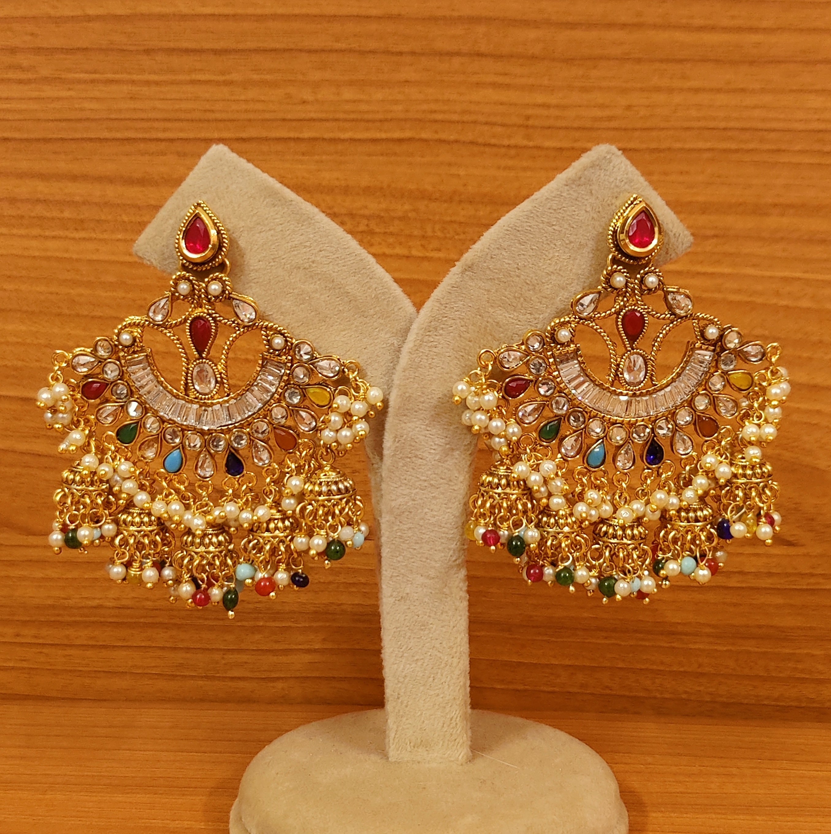 These multicolour chaandbaali earrings are handcrafted in copper alloy with imitation multicolour stones, pearls & cz of fine quality. These artistic yet modern earrings are plated with fine nickle free gold rhodium to avoid any allergies to the skin.