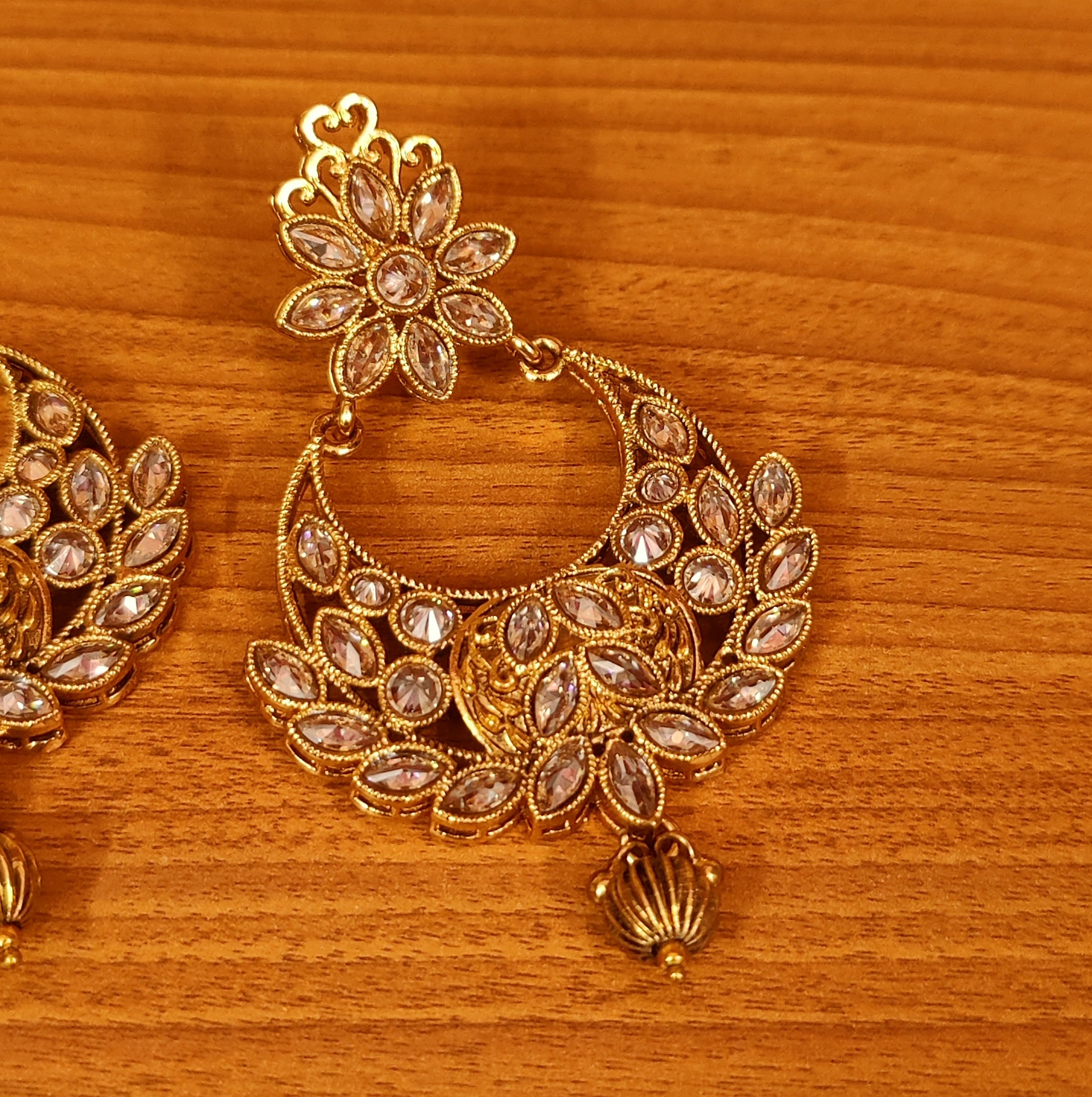 These beautiful earrings and maang tikka set is handcrafted in copper alloy with imitation polki stones of very fine quality. These artistic yet modern earrings are plated with quality antique gold plating, earrings are very light in weight.