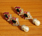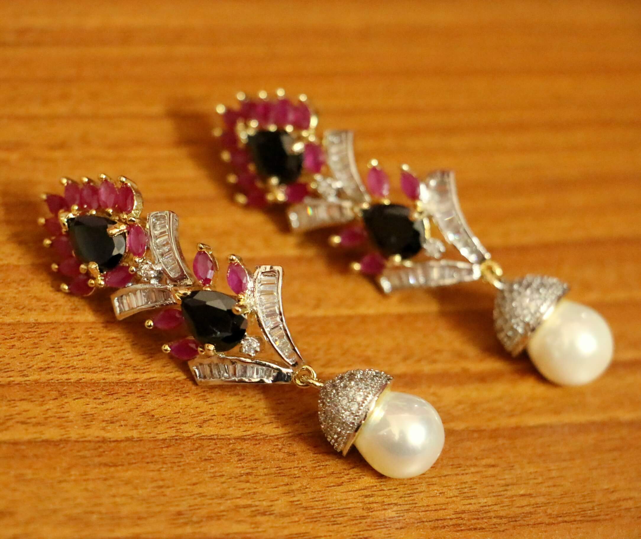 These diamond look danglers are handcrafted in silver alloy with imitation black onyx colour quartz, pearl & cz stones of very fine quality. These earrings are plated in 18kt gold rhodium plating which gives the design a real jewelry look .