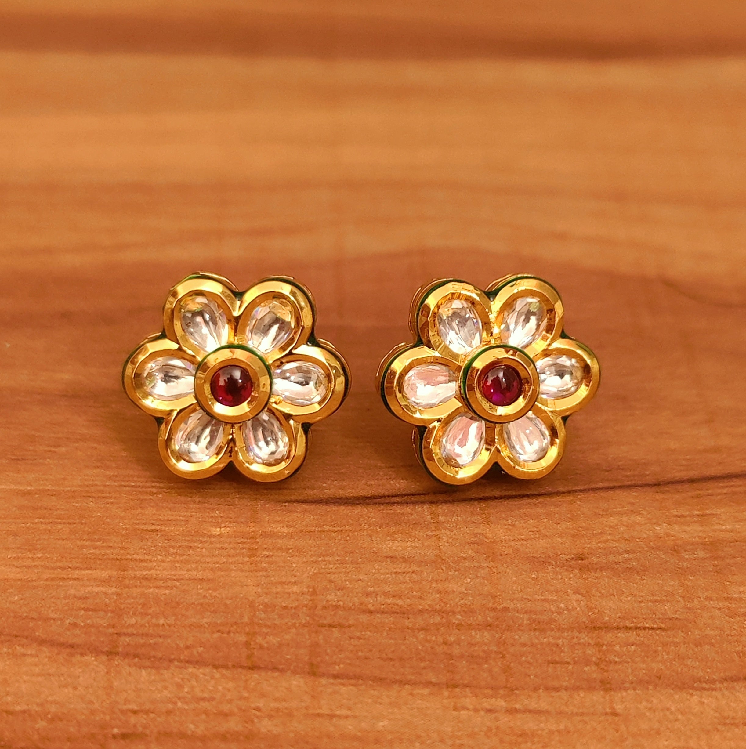 These beautiful flower pattern studs are handcrafted in brass alloy with imitation red colour stone and kundan with meenakari work of very fine quality. these artistic yet modern earrings are plated with high quality gold rhodium. the earrings are very light in weight.