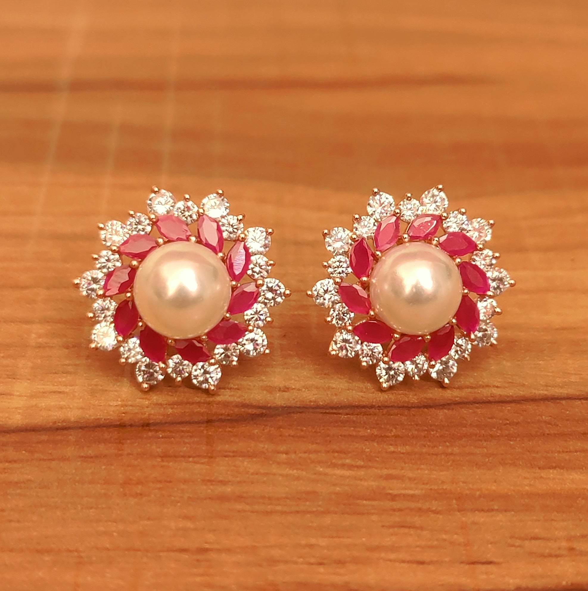 These beautiful studs are handcrafted in silver alloy with imitation red colour stone & cz stone and pearls work of very fine quality. these artistic yet modern earrings are plated with high quality rose gold rhodium. the earrings are very light in weight.
