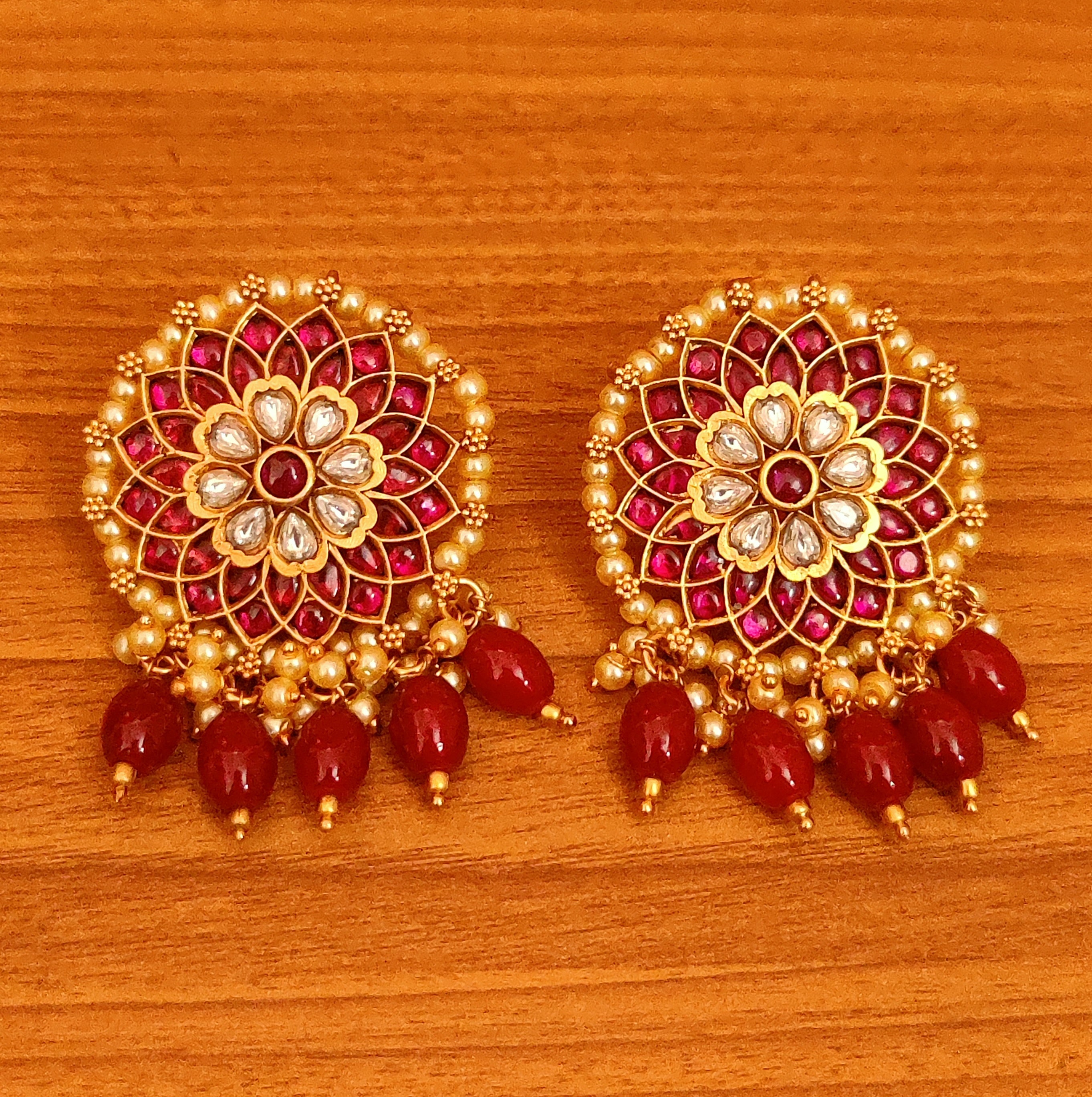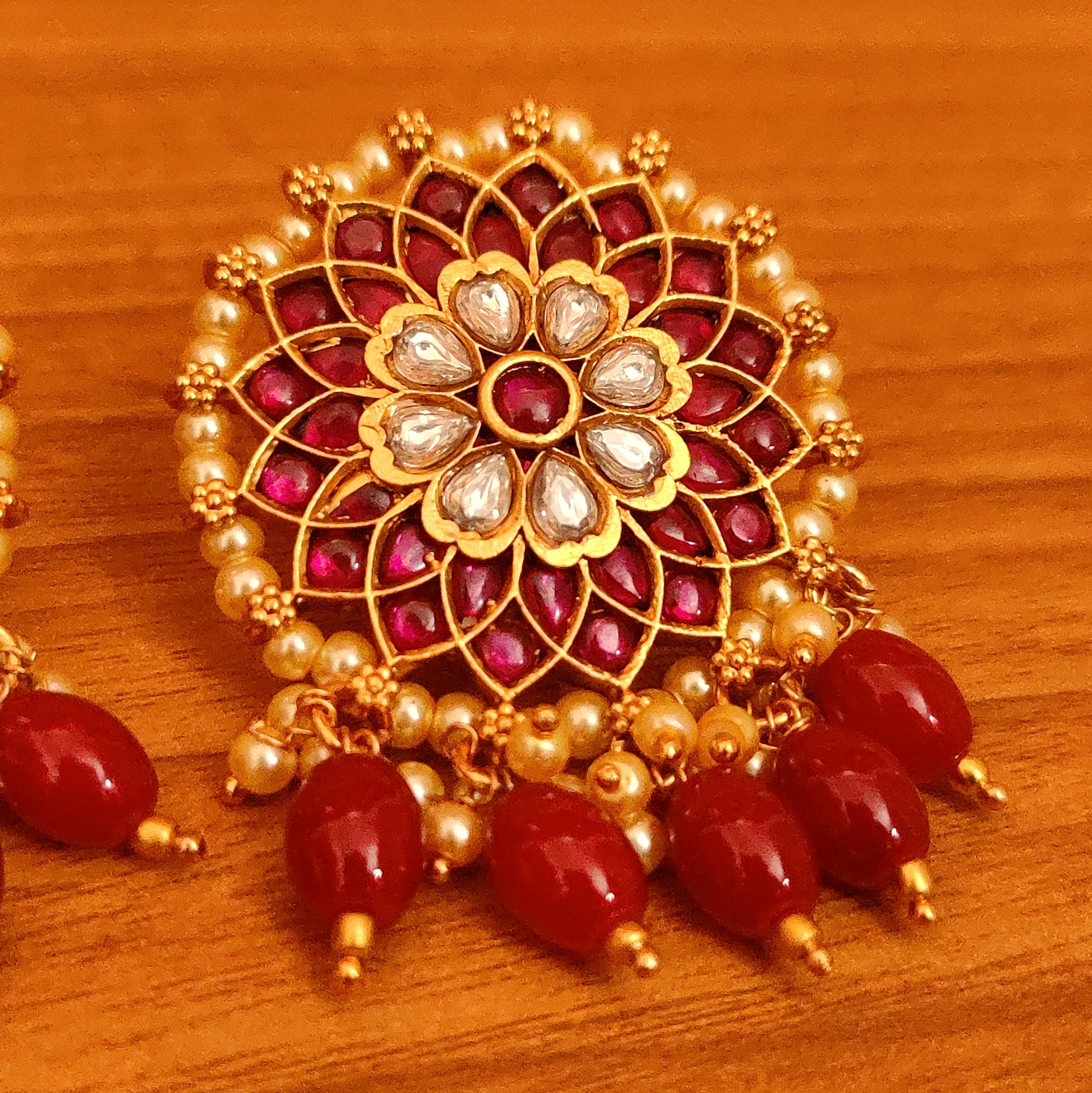 These beautiful matt gold polki earrings are handcrafted in brass alloy with imitation red colour stone & semi precious pearl, beads and zircon work of very fine quality. these artistic yet modern earrings are plated with high quality gold rhodium. the earrings are very light in weight.