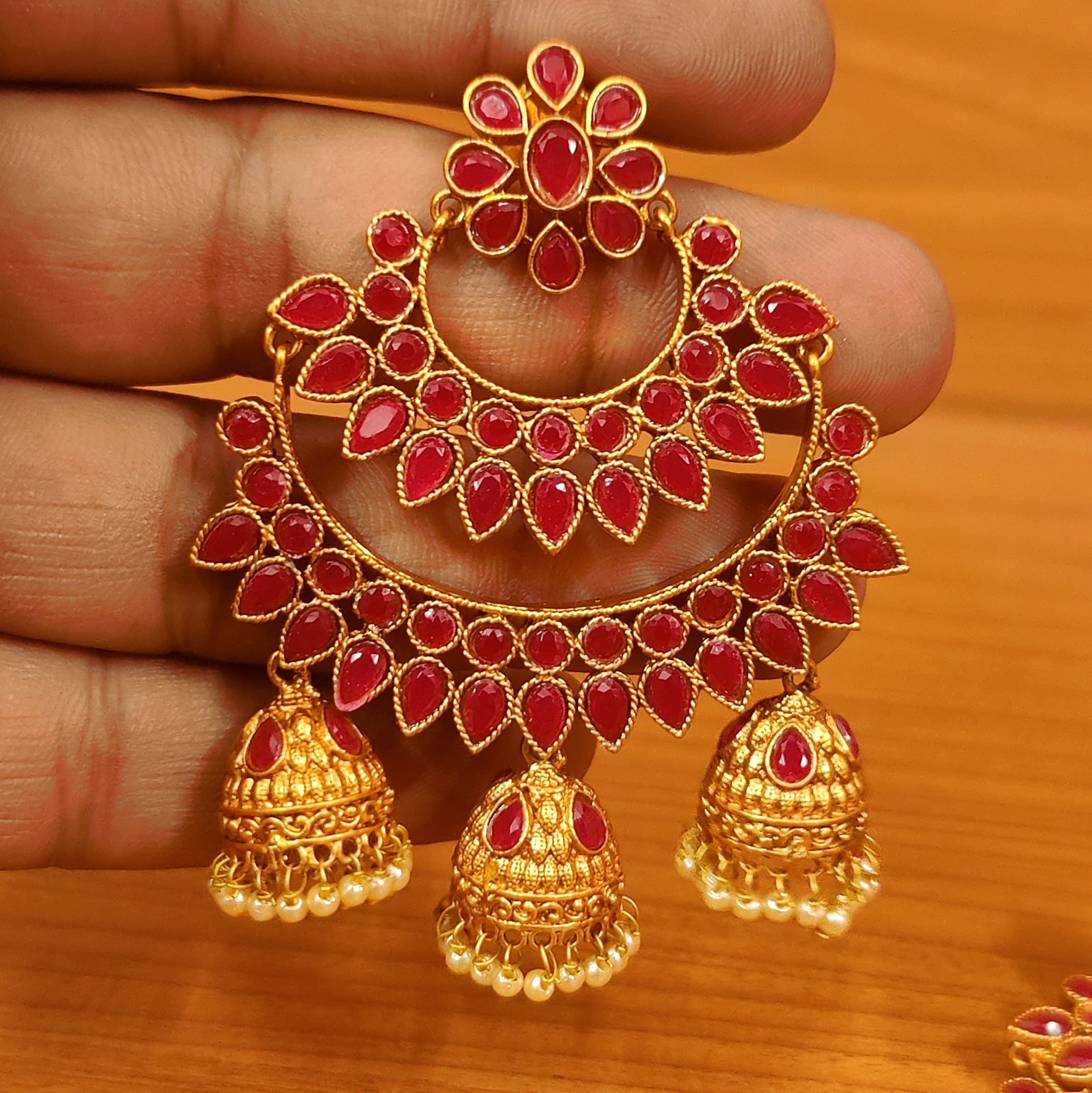 These ruby matt gold look chaandbaali earrings are handcrafted in copper alloy with imitation ruby stones & pearls of fine quality. These artistic yet modern earrings are plated with fine nickle free matt gold rhodium to avoid any allergies to the skin.