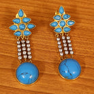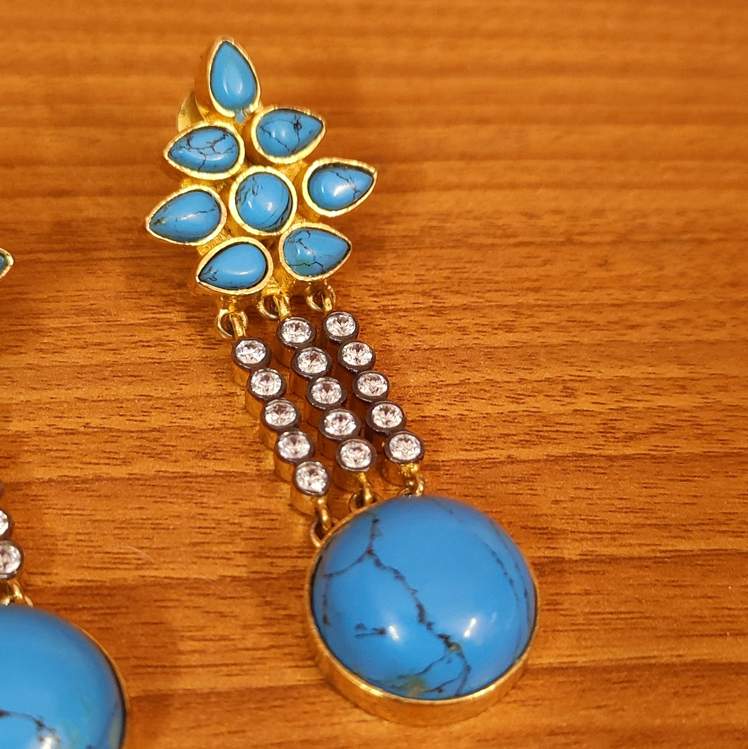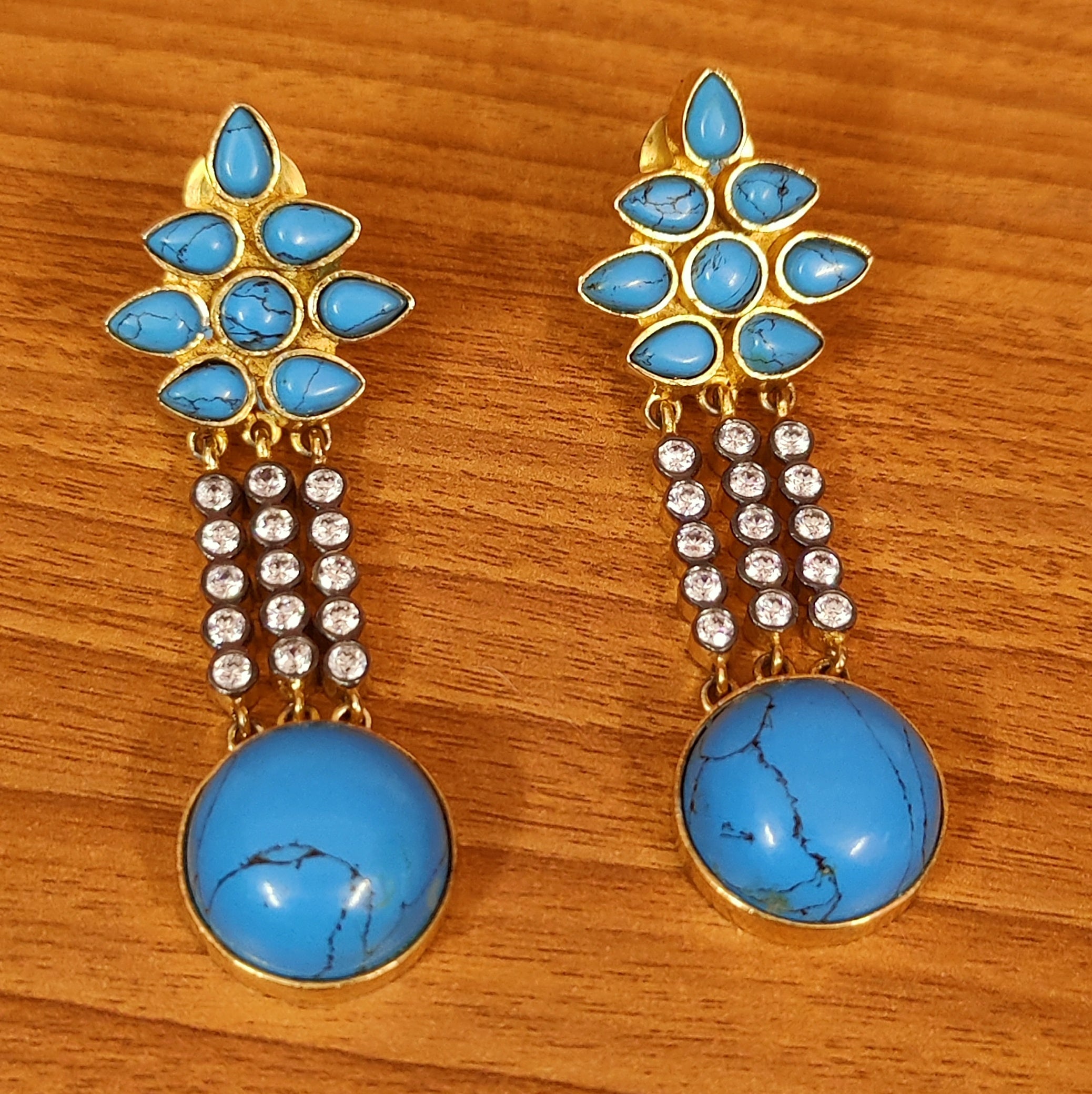 These signity studded turquoise danglers are handcrafted in brass and silver alloy with imitation turquoise colour stones & cz stones of fine quality. These artistic yet modern earrings are plated with fine nickle free gold rhodium to avoid any allergies to the skin.