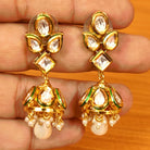 These kundan polki jhumkas are handcrafted in silver and brass alloy with imitation pearls & kundan polki stone of very fine quality. These party wear jhumkas are plated with real 18kt fine nickel free gold rhodium to avoid any allergies to the skin.