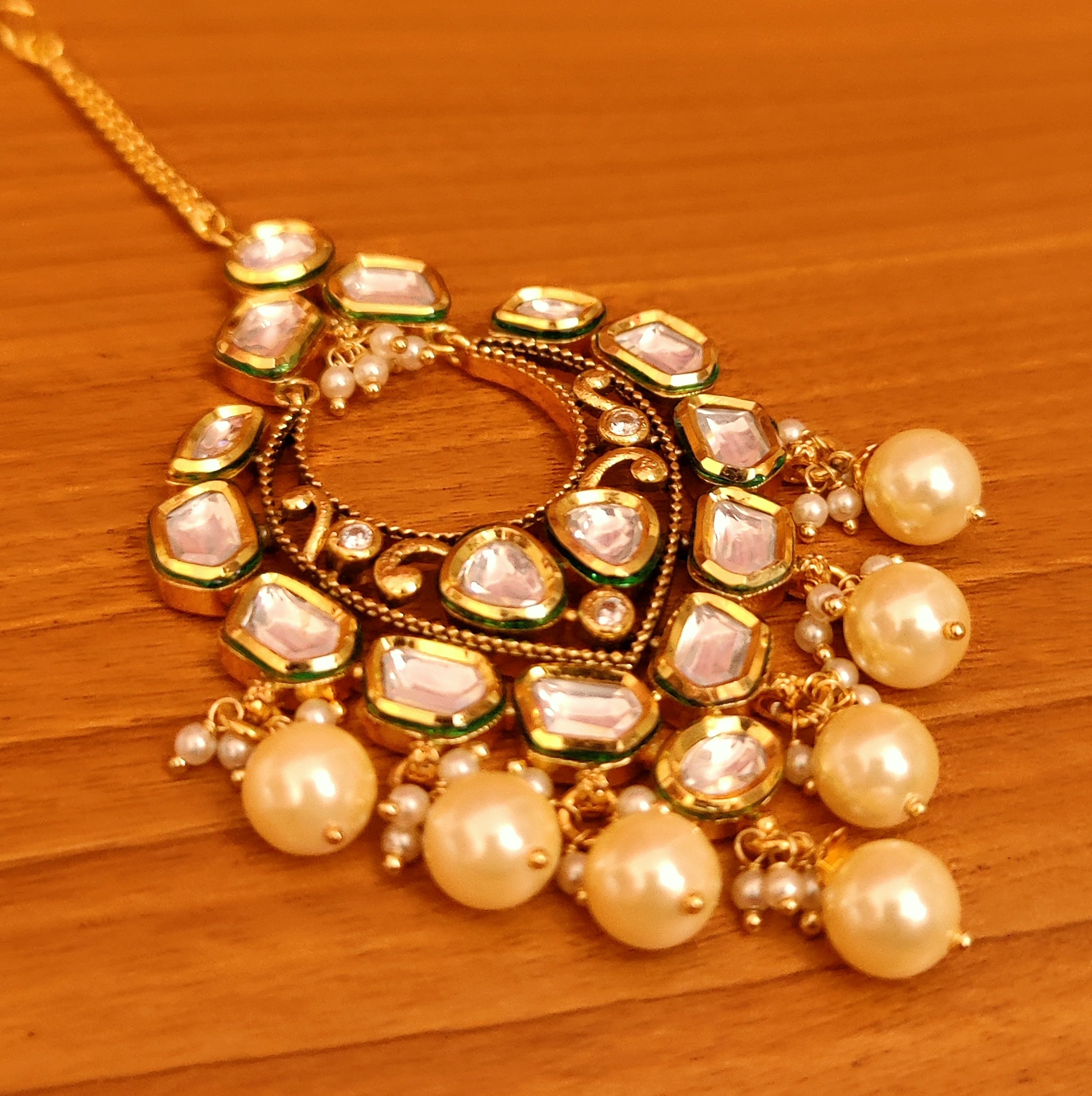 Kundan & Gold Beads Pachi Kundan Maang Tikka
